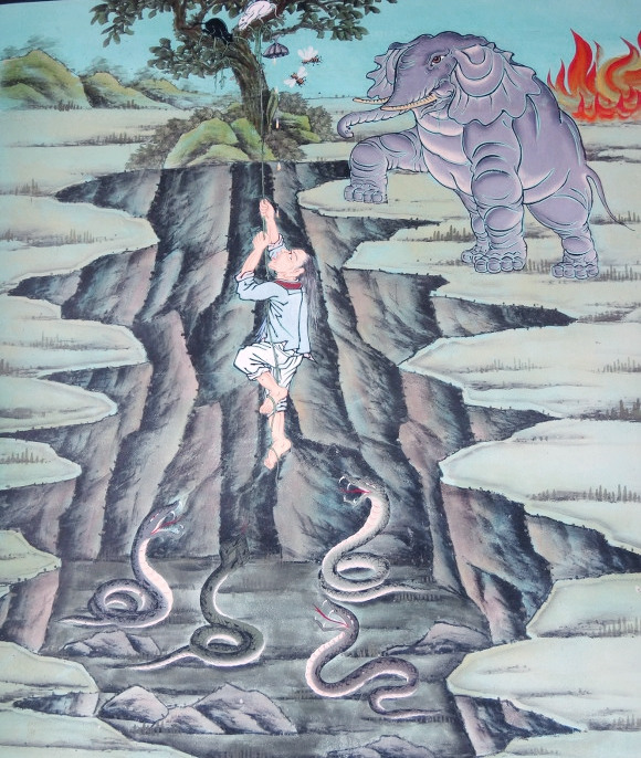 오래전 어느 사찰의 외벽에서 본 벽화가 떠올랐다. 들불이 덮쳐오자 길 가던 나그네는 빈 우물로 피한다. 가파른 낭떠러지 아래. 발치엔 혀를 날름대는 뱀이 우글거린다. 위에서는 미쳐 날뛰는 야수가 발을 구르고 섰다. 절체절명의 공간. 밧줄같이 늘어진 칡덩굴에 의지해 겨우 버티고 있는 한 사람. 칡 줄기에 붙은 벌집에서 그의 입으로 똑똑 꿀이 떨어진다. 그는 꿀맛에 빠져 찰나의 열락에 취해있다. 칡덩굴 중허리를 흰쥐와 검은 쥐가 간단없이 쏠고 있음에도 불구하고. 이는 '불설비유경’에 나오는 안수정등(岸樹井藤)이라는 불교설화다.