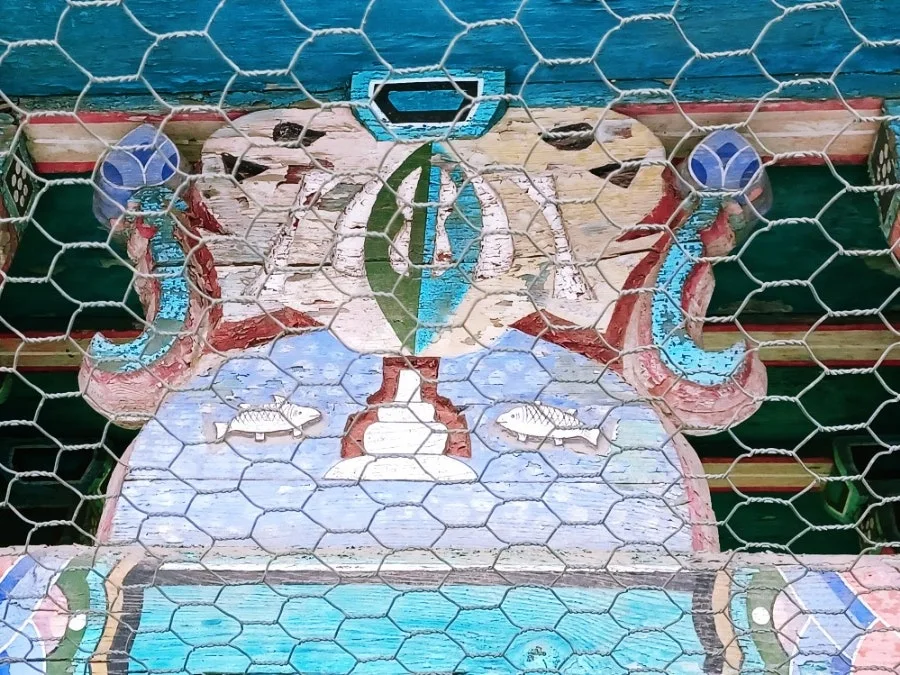 거기에는 남방식 불탑과 한 쌍의 잉어, 두 개의 양궁과 두 마리의 코끼리와 연꽃 봉오리가 좌우대칭으로 그려져 있다.