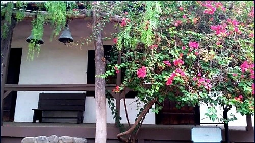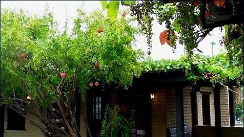부겐벨리아 꽃 화사하고 후추나무 휘늘어진 아빌라 어도비의 원래 도로변 입구인 현관
