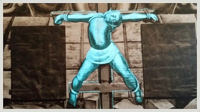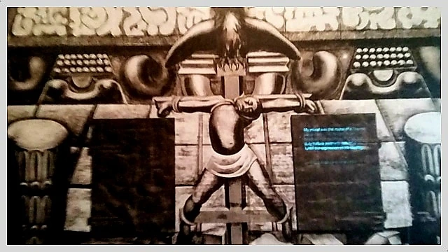 십자가에 매달린 인디오 그리고 그 위에 앉아있는 독수리와 독수리를 겨냥한 저격수.