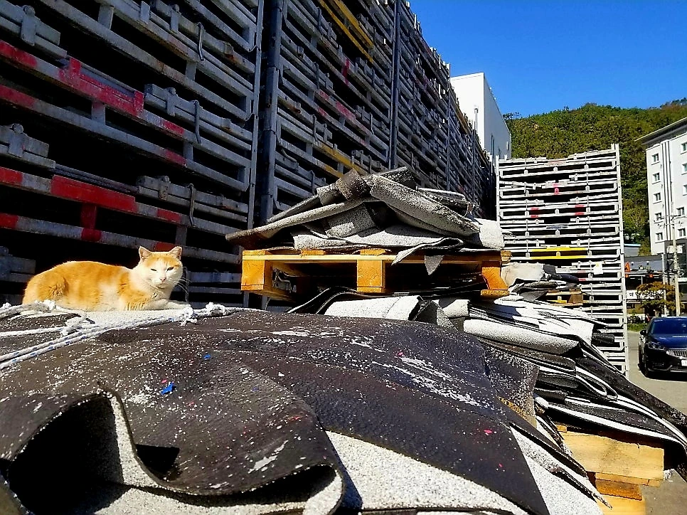 가을볕바라기를 하는 고양이 뒤로 쌓인 낯선 물건, 스틸로 만든 이 틀을 펴면 꽝꽝 언 통 참치를 등급별 크기별로 분류해 담는 사각통이 된다는데 감이 안 잡혔다.