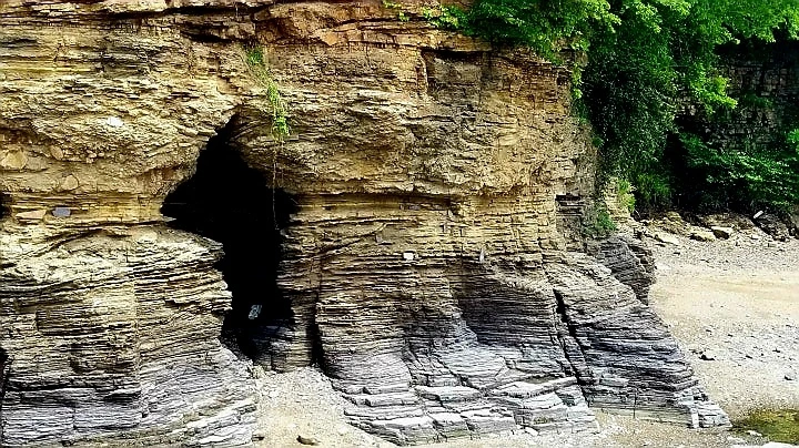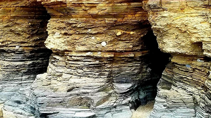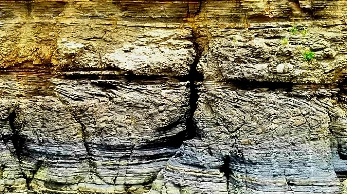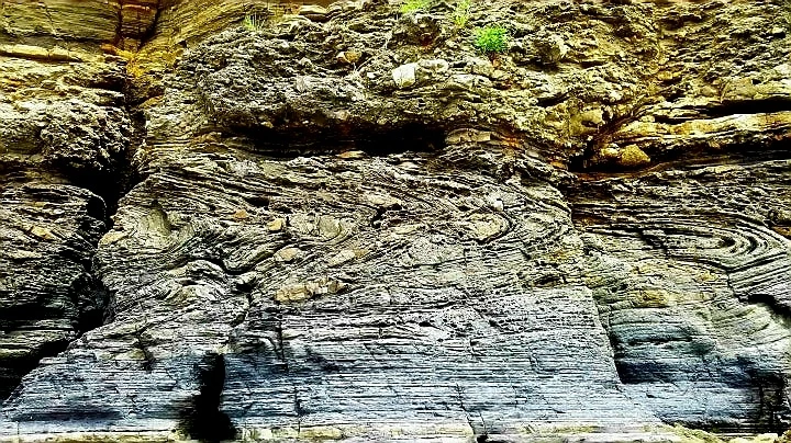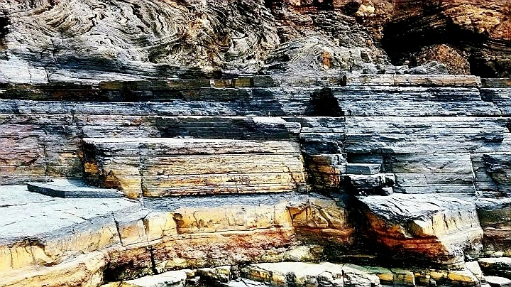 이곳은 해식절벽에 의해 동굴이 노출된 퇴적층, 습곡이나 단층과 같은 지질 구조라 한다. 마그마의 관입에 의해 형성된 관입암체, 생성 환경을 유추할 수 있는 다양한 자갈로 구성된 역암층, 과거의 호수 환경에서 발달한 삼각주 로브 퇴적체와 같은 학습요소가 풍부하여 야외학습장으로서 매우 중요한 가치를 지녔다는 안내문이 쓰여있다. 로브는 돌출부를 이르겠고 관입암체(貫入巖體)란 화성암 가운데 마그마가 지표 위로 분출하지 않고 지각 내에서 굳어 이루어진 암석을 뜻한다고. 마그마가 암석 내로 뚫고 들어가 내부에서 굳어 만들어진 암석이 관입암(貫入岩, intrusive rock). 지질학에 문외한이라 안내글마다 대체 무슨 말인고? 궁금해 일일이 검색해봐야 했다.