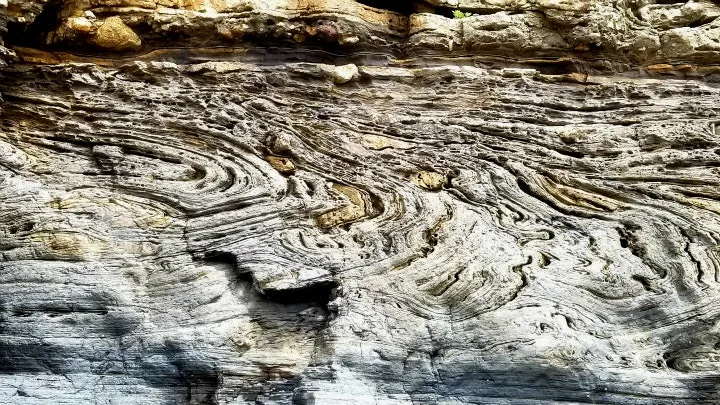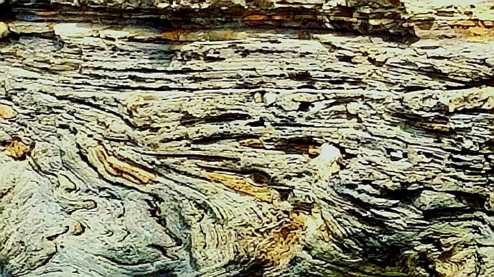 실제로 암면 곳곳에서 벌건 용광로 쇳물 쏟아지며 치달리다 멈춰 선 채 소용돌이치는 마그마의 절규가 또렷이 짚인다. 암반층이 종잇장처럼 구겨져 있는가 하면 비정형으로 찌그러졌다. 마구잡이로 뒤범벅이 된 채 멈춰버린 용암의 흔적. 오싹 전율이 일 정도로 적나라하다. 그날 침침해진 하늘에서 화산재 비처럼 쏟아져 내리고 연기 자욱하게 피어올랐으리라. 번개 치듯 불길 쭉쭉 뻗어나가는 순간순간 그 얼마나 외경스러운 장관을 연출했을까. 불덩이 같은 쇳물 마구 달려드는 그 위용 얼마나 가공스러웠을까. 경악 바세도우(Schreck Basedow)라던가, 폼페이 유적 발굴지에서 두 눈 부릅뜬 채 화석이 되고 만 로마인 표정 떠오르게 하는 정경이다.