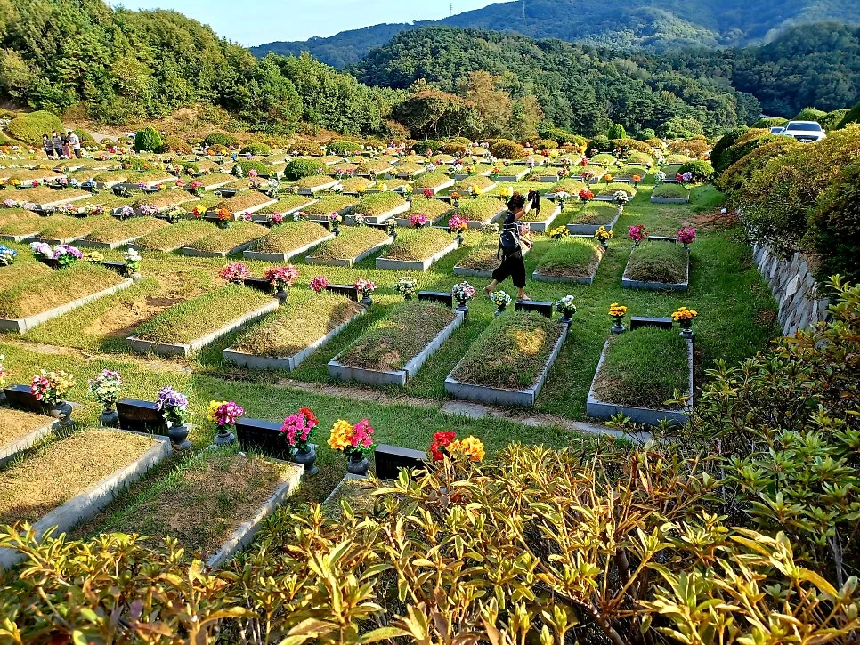 잔디가 고르게 덮여있는 산소에 오후 양광이 금빛으로 내려앉았다.
