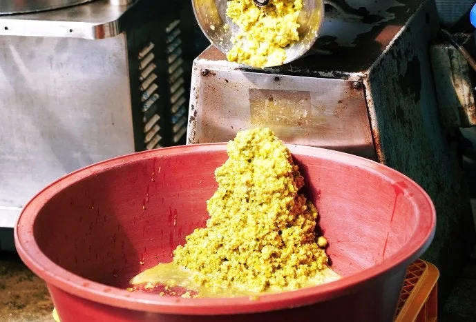 풋감을 따서 분쇄기에 넣자 곱게 갈린 땡감은 연둣빛 무더기로 변했고 그걸 꼭 짜서 즙을 냈다.