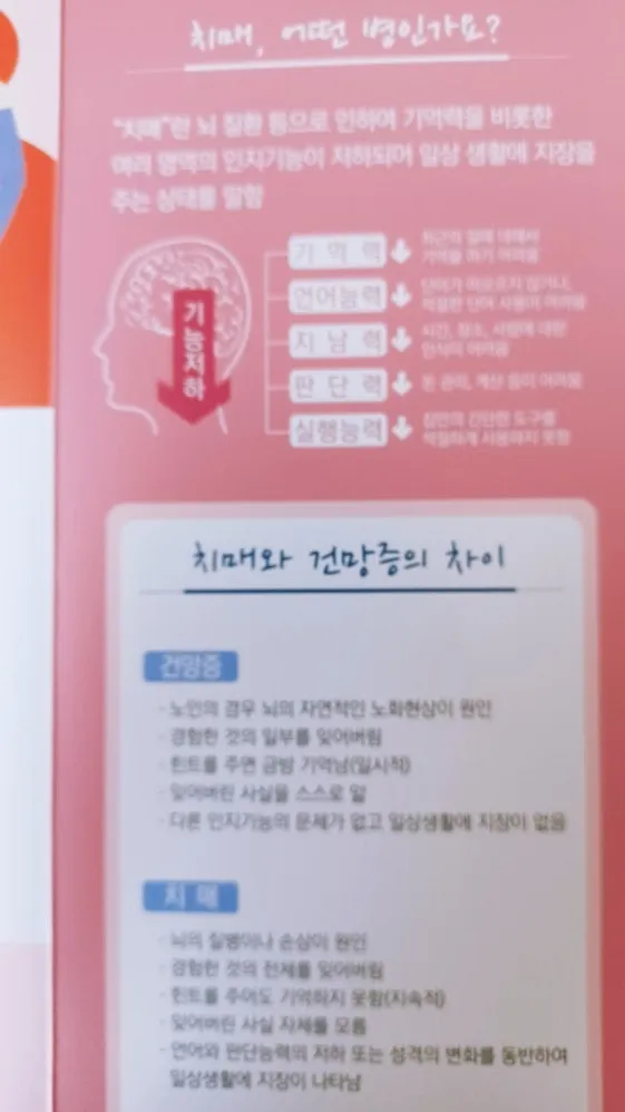 치매는 기억하고 사고할 수 있는 능력을 담당하는 뇌가 손상되거나 나이 들어 점차 감퇴하므로 일상생활에 영향을 미칠 정도면 질환이다.