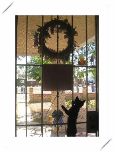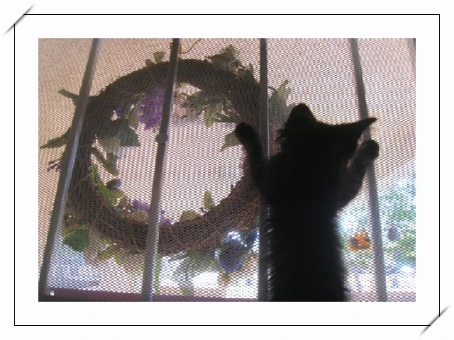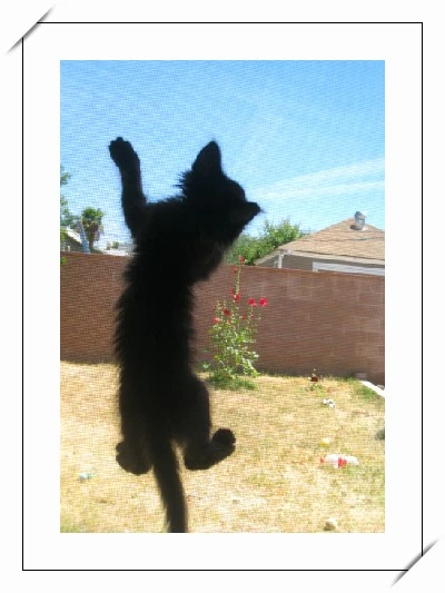 공중부양 중? 뒷마당에서 참새 소리가 나자 그걸 잡겠다고 설치며 방충망에 찰싹.