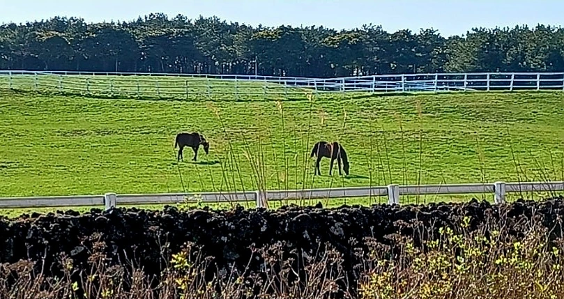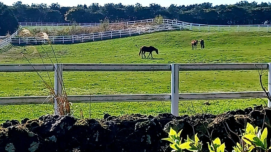 하얀색으로 칠한 나무 울타리 너머 저만치에 제주 조랑말 서너 마리가 풀을 뜯고 있었다.