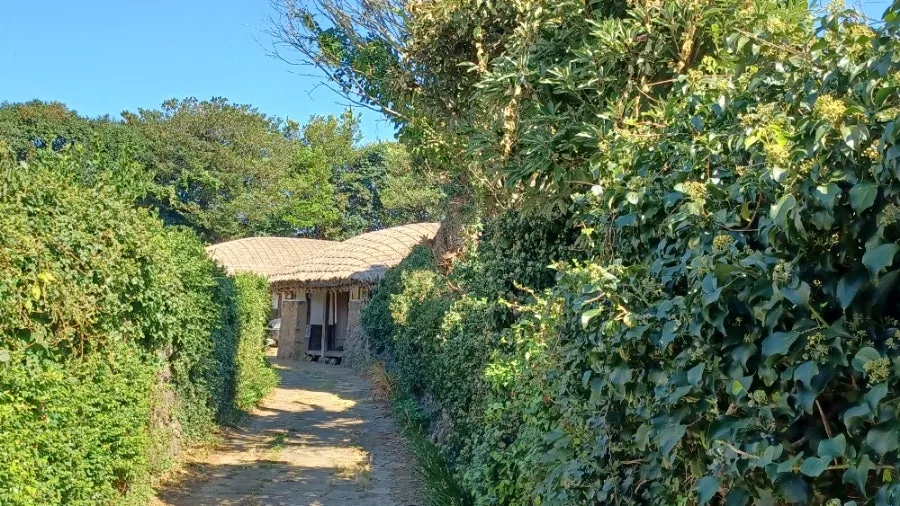 가옥 내부가 훤히 들여다보이지 않도록 약간 휘어져 있는 올레를 거의 다 들어서자 촘촘 엮은 지붕을 얹은 초가가 드러났다.