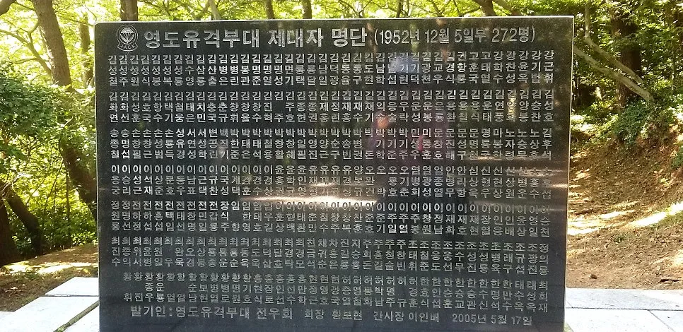 오석으로 된 비문에는 이렇게 새겨져 있었다. “군번도 계급도 없었던 대한의 젊은 영도 유격 부대원들은 보수나 대가 또한 바람 없이 다시 못 올 결의로 떠나던 날 태종대 이 소나무 저 바위 밑에 머리카락 손톱 잘라 묻어 놓고 하늘과 바다로 적 후방에 침투하여 숨은 공 세우다 못다 핀 젊음 적중에서 산화하니, 아아! 그 죽음 헛되지 않아 호국의 넋이 되어 국립묘지 합동 위령비에 모셨도다. 가신 동지들의 요람지 태종대 반공의 정기 어린 이곳을 못 잊어 작은 돌 하나 깎아 영도 유격 부대 유적지의 거룩한 자취를 남기노라.” 머리카락을 이 산하에 묻어두고 마지막 길 각오한 비장감이 눈가 뜨겁게 만든다. 군번도 없이 일련번호만 부여받았던 그들은 북괴군에 맞서 초개같이 목숨 바쳐서 대한의 자유를 되찾게 해 줬다.