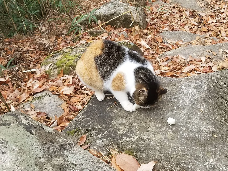 자르르 윤기 나는 냥이, 비쩍 여윈 상태 아니라도 마침 배낭에 점심 대신 받은 떡가래가 있길래 여러 쪽으로 나누어 큰 바위 헌식돌 삼아 얹어놨지요.
