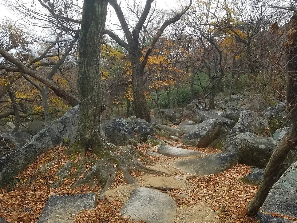 정확히는 천왕문과 직선거리에서 마주 보이는 바위 더미 널브러진 계곡 입구로 들어가 약 오백 미터쯤 걸어가면 되는데요.