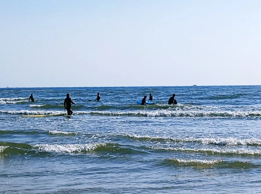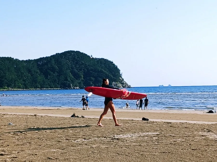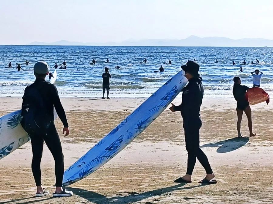 서핑 보드를 옆구리에 끼고 급히 내닫던 서퍼들은 바다로 신나게 뛰어들었다.