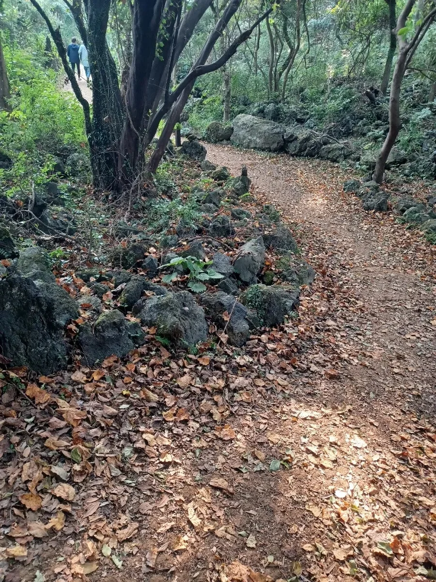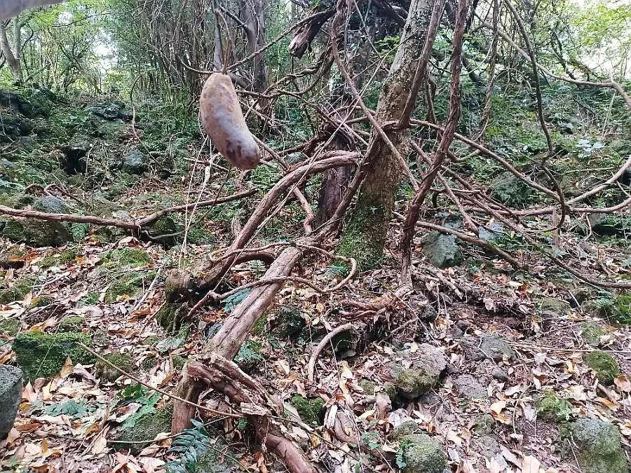 곶자왈은 제주에만 있는 독특한 지형으로 화산활동 중 분출한 용암류가 만들어낸 불규칙한 암괴 지대라네.