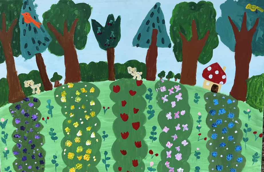 루아가 미술학원에서 전시회를 준비하며 그린 꽃밭 그림이다.