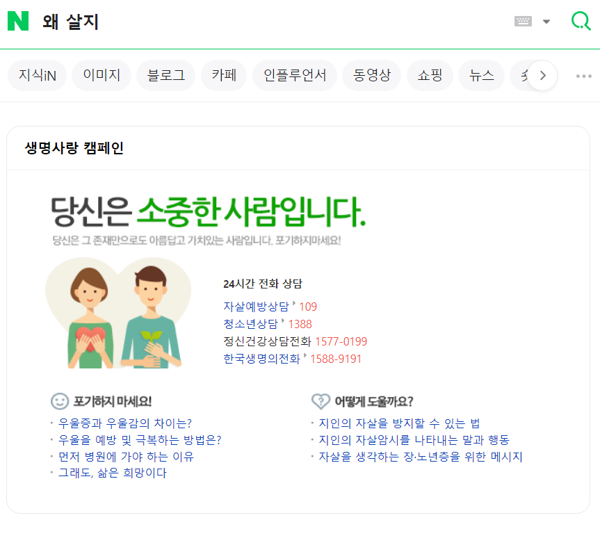 네이버에서는 왜 살지로 물어보면 이 사람이 우울증이거나 자살을 시도하는 사람이라고 인식이 되어있었나 보다.
