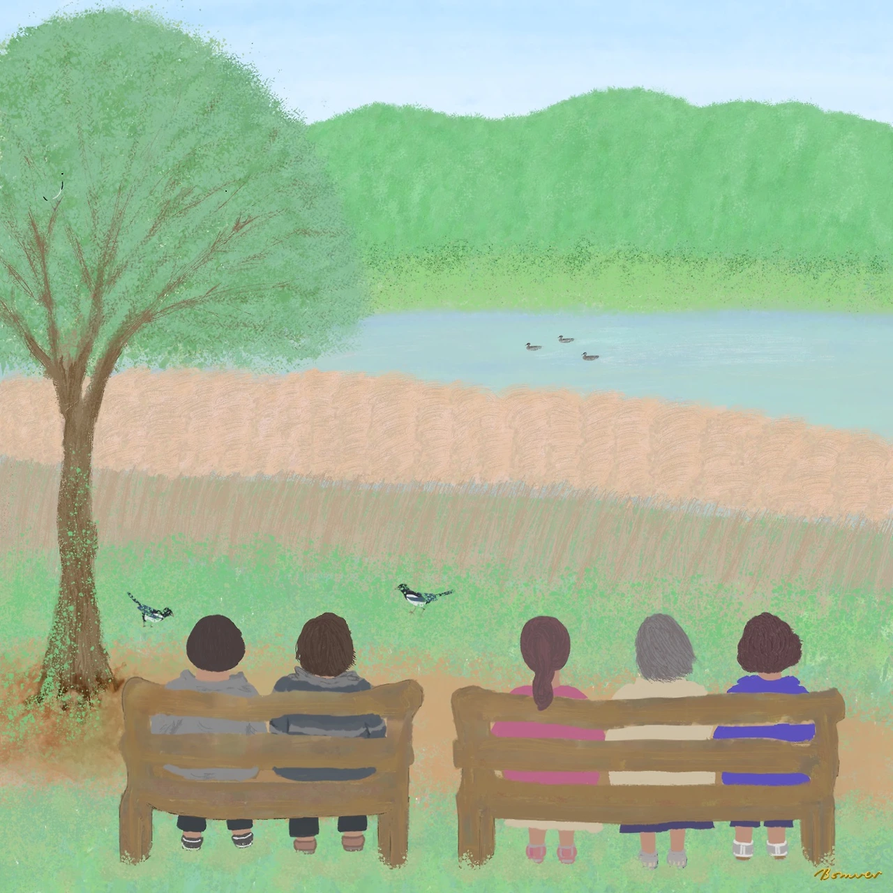 까치 두 마리가 서로 간격을 두고 있지만 정답게 풀사이에 먹이를 쪼아 먹는 모습을 볼 때, 물속을 올라갔다 내려갔다 숨바꼭질하듯 물장구를 치다가 유유히 물길을 내는 오리 떼의 모습을 볼 때, 비밀스럽고 고요하게 삶의 본질을 들여다볼 수 있다.