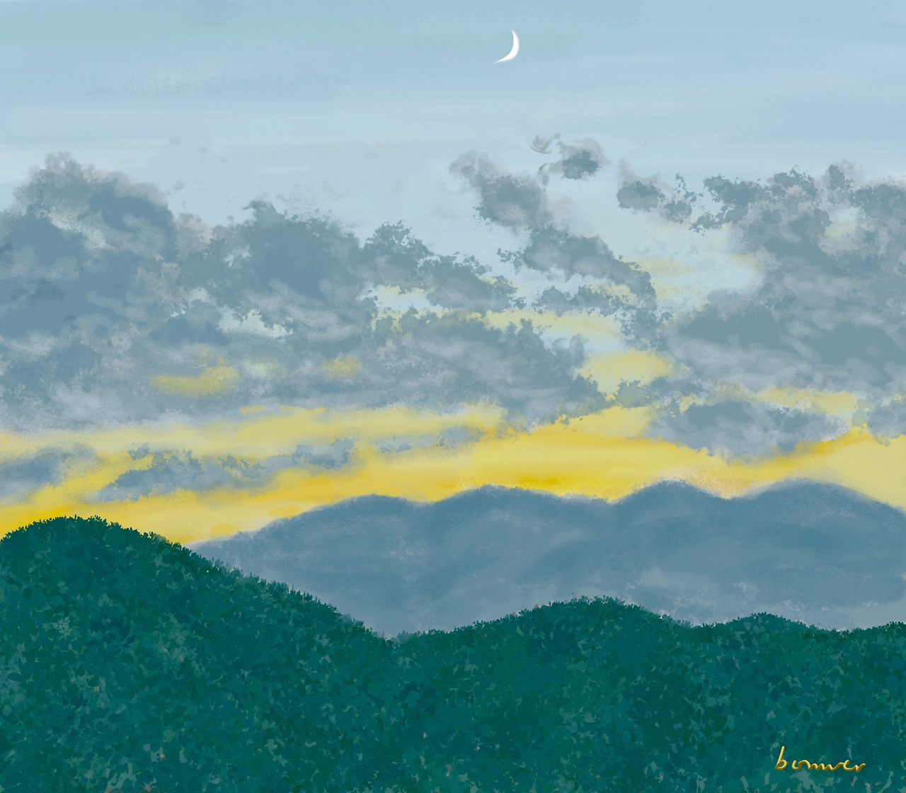 비가 온 뒤의 저녁하늘에 산이 드리워진다. 집 앞 작은 동산의 나무들이 하늘에 드리워진 산과 만나며 웅장하고 깊은 먼 곳에 있을 산속 풍경으로 변한다. 하늘과 땅의 경계가 사라진다.