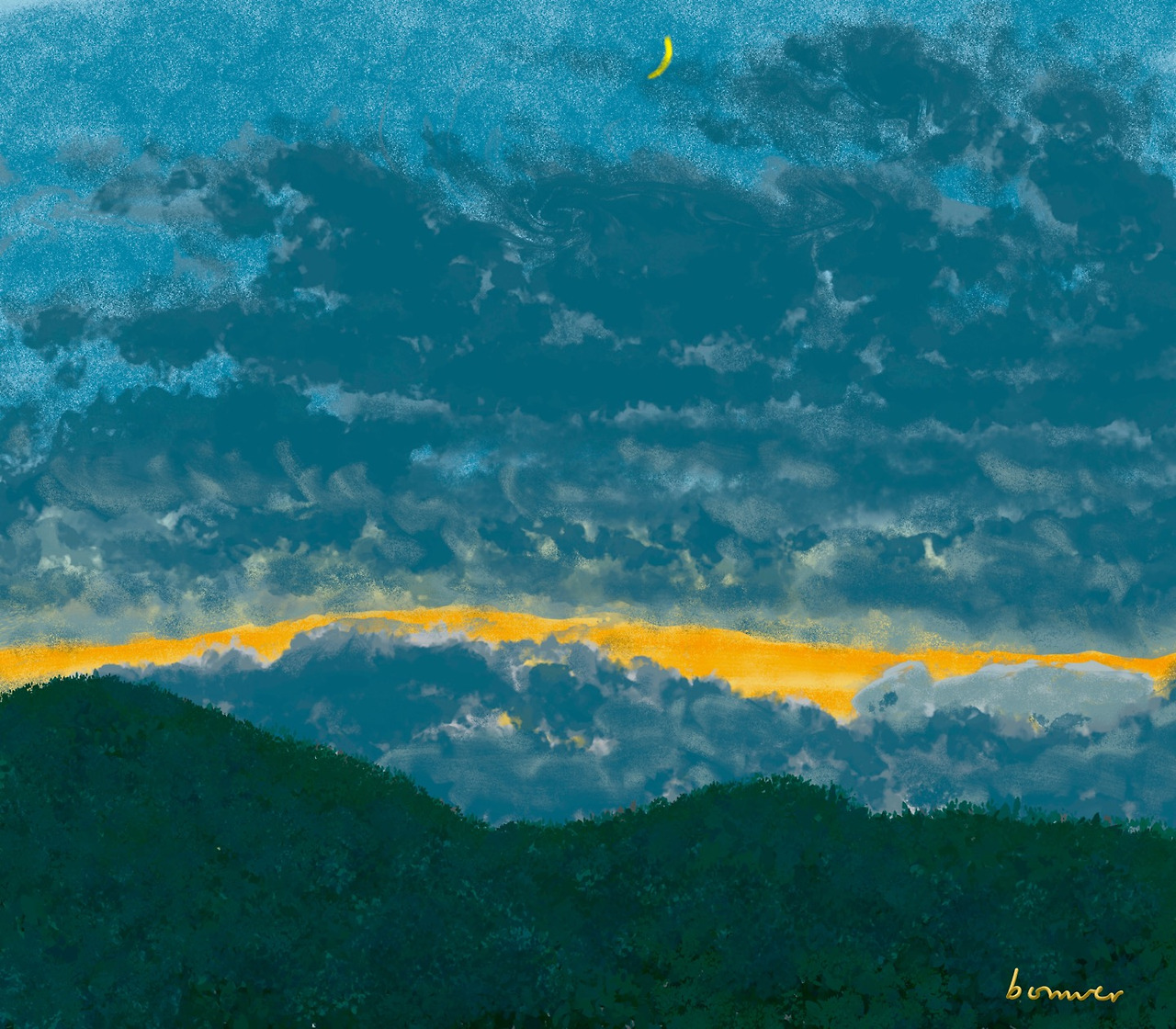 이리저리 뛰노는 구름들 사이에 어느덧 하얗던 초승달이 노란 빛으로 변했다. 하늘은 검푸른 색으로 덧입혀졌고 노란 달의 선명하고 투명한 빛에 눈빛이 고정되어있을 때 어디서 인지 모르게 갑자기 몰려든 짙은 구름 덩어리가 합류하며 조그만 달빛마저 조용히 숨겨버린다.