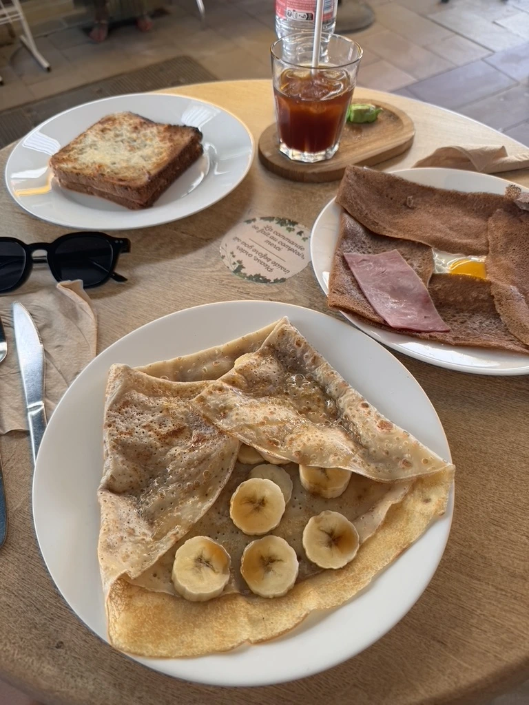친구와 나는 출출해서 크레페를 먹었다. 사실 이것이 내 첫 크레페였다. 크레페는 얇은 밀가루 반죽 위에 바나나나 초콜릿 등을 얹어 사각형으로 반죽을 접어 내어주는 음식이다. J는 갈레트를 먹었다. 크레페는 간식같은 음식인데 비해 갈레트는 햄이나 계란 등을 넣어 간단한 한 끼도 되는 조금 더 든든한 음식이다.