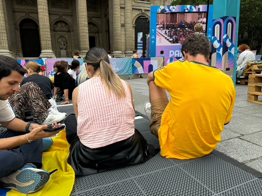 경찰이 가방을 검사를 하고 나서 우리는 그 펜스 안으로 들어갈 수 있었다. 대형 스크린 앞에 앉을 곳은 원래 있었을 법한 몇 개의 벤치들, 분수대의 둥그런 자리, 그리고 바닥 자리였다. 관람티비 앞 바닥에는 올림픽 관람을 위해 엉덩이를 대고 앉을 만한 푹신한 구역이 만들어져 있었다. 우리는 그 구역에 앉았다. 꽤나 앞쪽이었다. 그리고 인근 국가에서 밤새 달리는 버스를 타고 와 합류하기로 한 나머지 한 사람을 기다렸다.