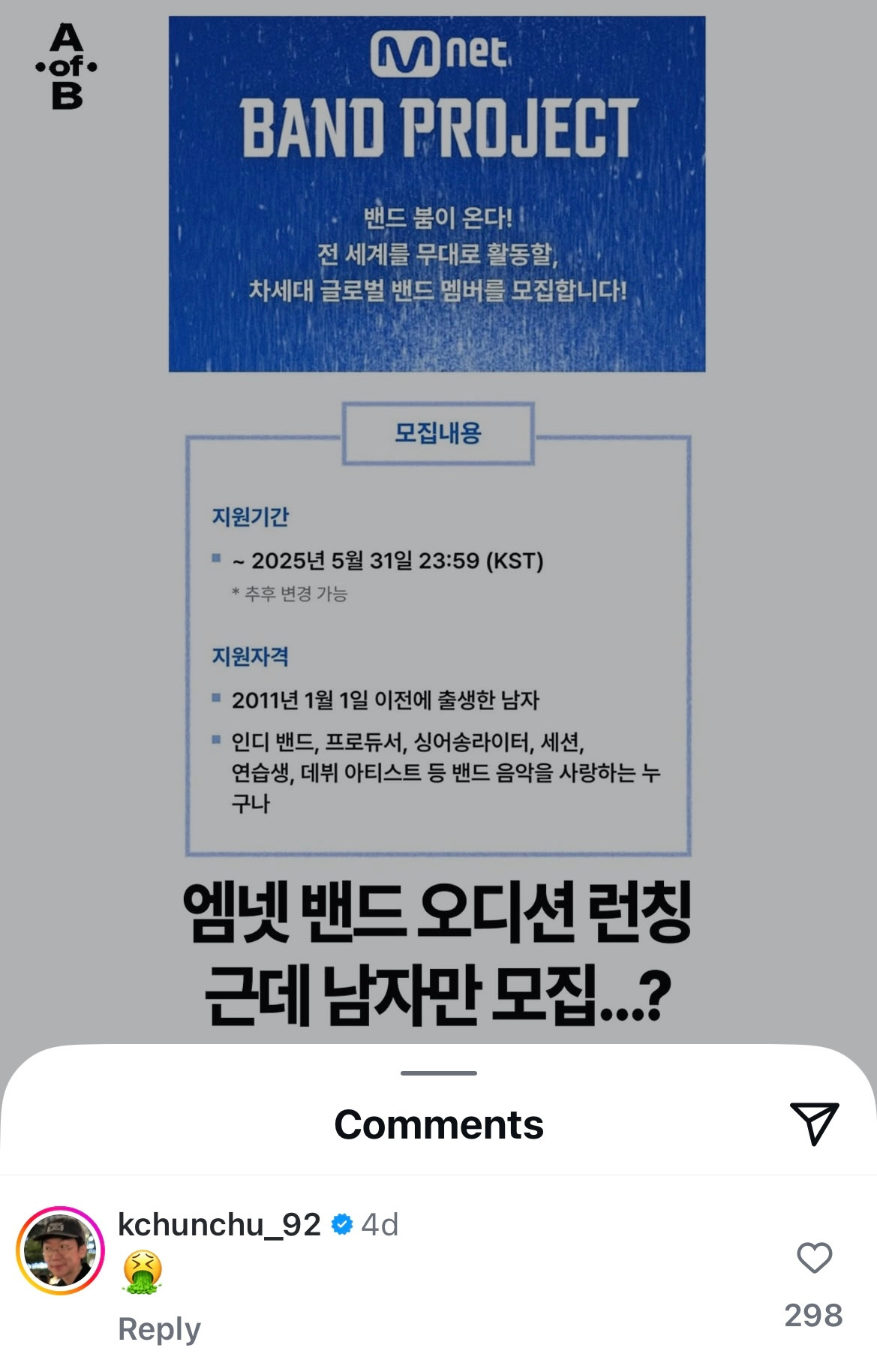 논란을 가속화한 부분은 엠넷이 해당 프로그램을 홍보하며 사용한 “밴드 붐은 온다”라는 문구입니다. 독특한 시제 사용으로 고유성을 갖는 이 문장의 출처는, 잘 알려지지 않은 밴드의 음악을 플레이리스트 형식으로 구성해 업로드하는 한 유튜브 채널이었습니다. 이후 개설된 동명의 인스타그램 계정 '밴붐온(AoB)'이 2024년 4분기 진행한 ‘밴붐컵’을 통해 국내 락 팬덤을 결집시켰고, 그 결과 웬만한 인디 뮤지션을 뛰어넘는 8만 팔로워 규모의 몸집으로 성장하면서, 계정명인 “밴드 붐은 온다” 문장 자체가 ‘붐’이 된 것이죠.