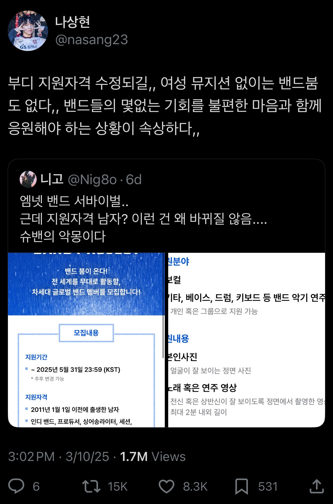 하지만 이 소식은 곧바로 국내 락 팬덤 사이에서 이목을 끌며 부정적인 반응을 불러일으켰는데요. 이유는 바로 자격 요건 때문이었습니다. 지원 자격 항목의 첫 줄에 적힌 “2011년 1월 1일 이전에 출생한 남자”라는 항목이 여성 뮤지션을 정당한 근거 없이 배제하여 기회를 박탈한다는 것이죠.