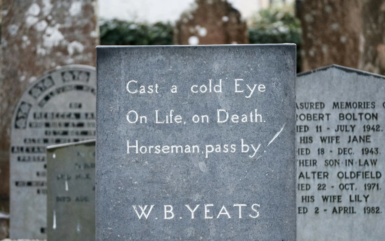 예이츠에 묘비에 적인 그의 언어가 적혀 있는데 사후 무덤을 위해 자신의 모비명을 정해주고 시를 노래했는데 그 시의 마지막 구절이 묘비명에 적혀있습니다. 이 시는 예이츠 사망 몇 달 전에 만들어진 <Under Ben Bulben> - ’벌벤산 아래‘라는 마지막 부분입니다.