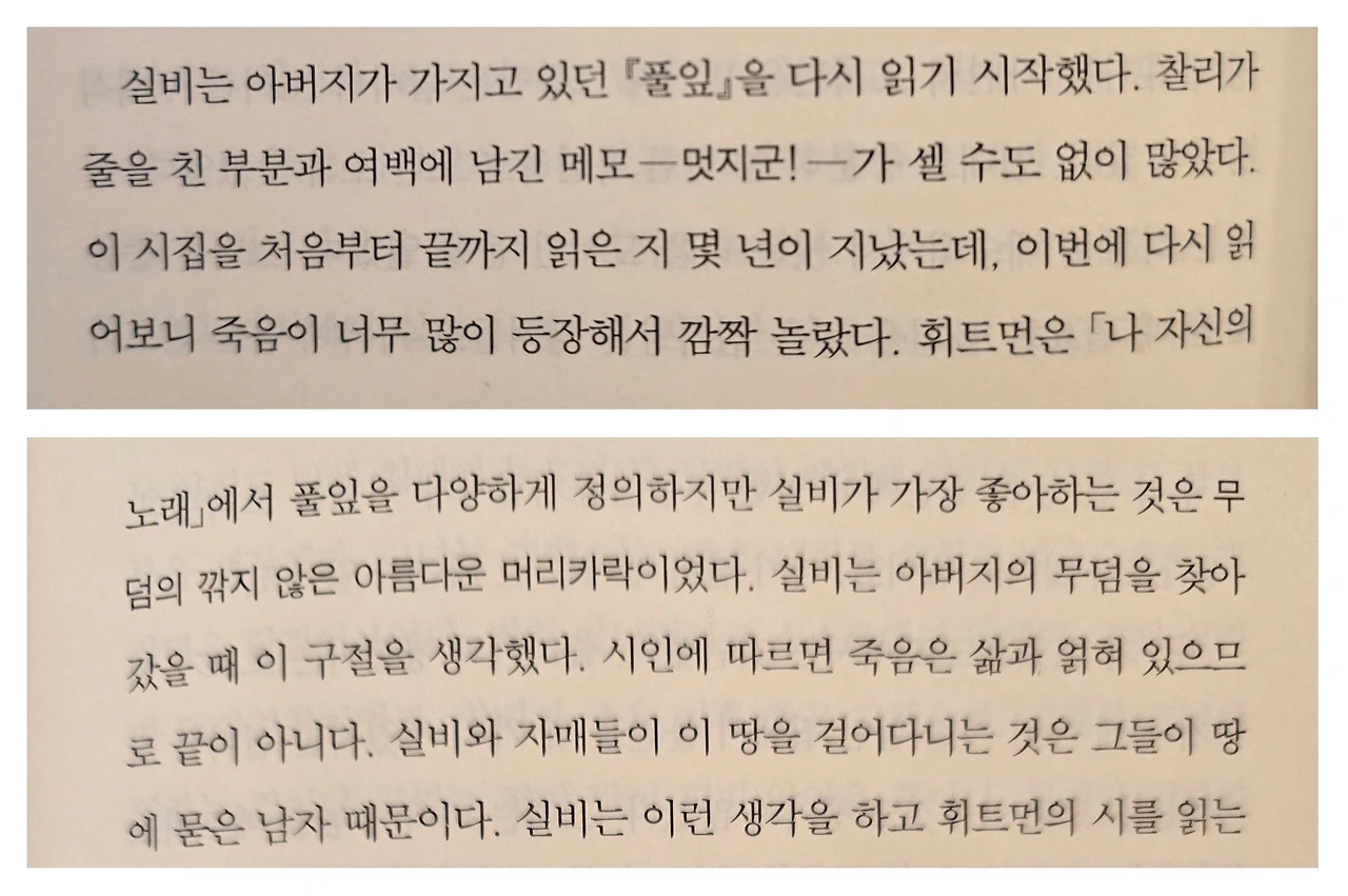 휘트먼의 시는 최근 ‘김영하 작가 북클럽’에서 히든 북클럽에 나왔던 도서 ‘헬로 뷰티풀’의 주인공 아버지가 좋아해서 아이들에게 읊어주는 장면이 나옵니다. 그만큼 많은 미국인들에게 영감과 감동을 준 시인이라 여겨집니다.