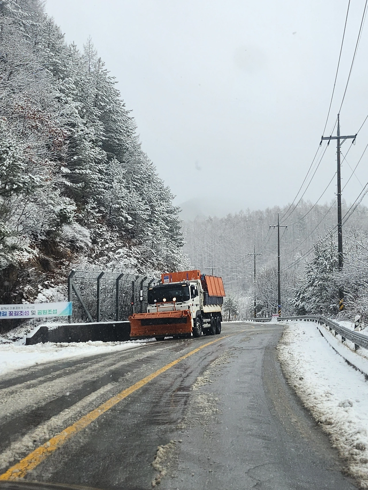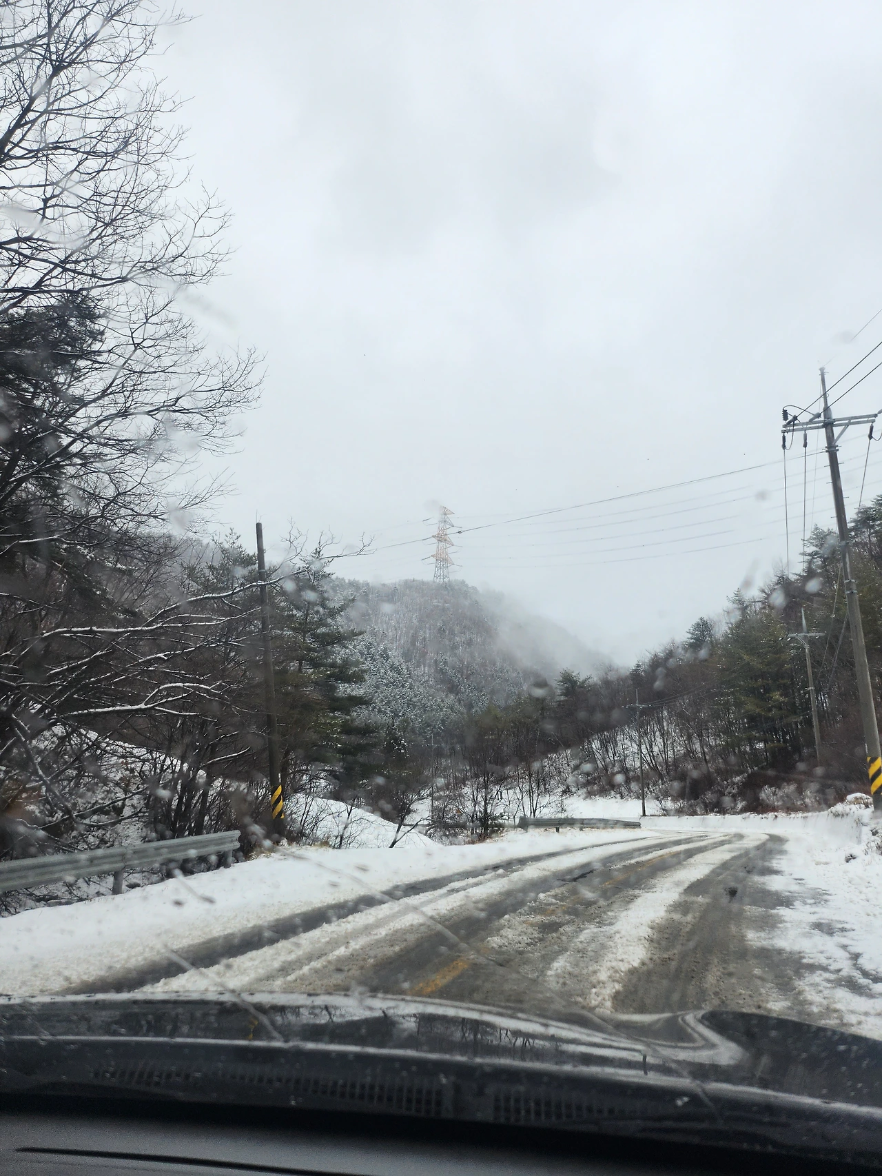 수번의 왕복된 산속의 외길을 달리느라 제설차가 맞은편으로만 지나가서 아쉬웠는데 두 시간 넘게 헤매는 동안 제설차의 열일과 천천히 그치는 눈으로 점점 도로가 제 모습을 드러내고 있었다. 그렇게 3시간 만에 강원도 산 도깨비를 벗어나 사람들이 사는 다른 도시로 이동할 수 있었다.