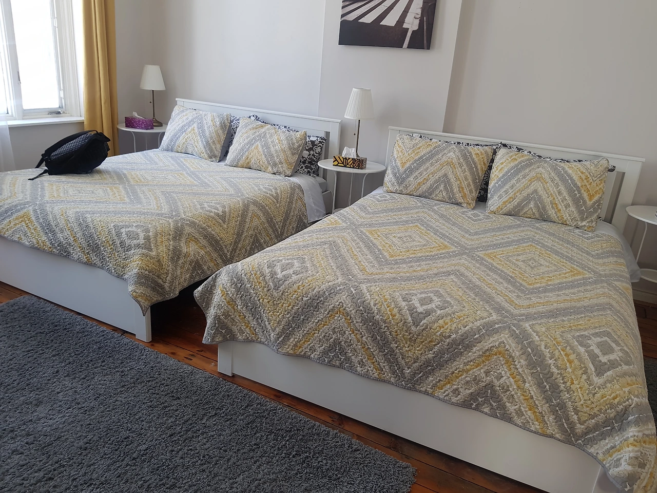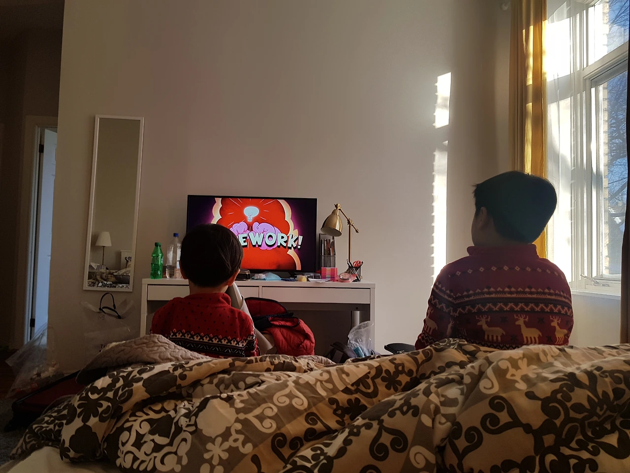 3층짜리 건물에 우린 2층의 방 2개 중 하나를 써야 했다. 큰 킹사이즈 침대 2개가 있고 딸려있는 화장실도 있는 방. 바닥의 마루는 곳곳이 썩어있었고 카펫으로 덮여있는 난생처음 보는 환경에 난감해하고 있는데 “엄마 밖에 나가자 눈이 많아! 눈싸움하고 놀자!” 아깐 비행기에서 그렇게 안 일어나더니 눈을 보니 배도 안 고픈가 보구나. 잠시 엄마 숨좀 돌리게 기다려보라니 어느새 티브이부터 켜보는 아이들