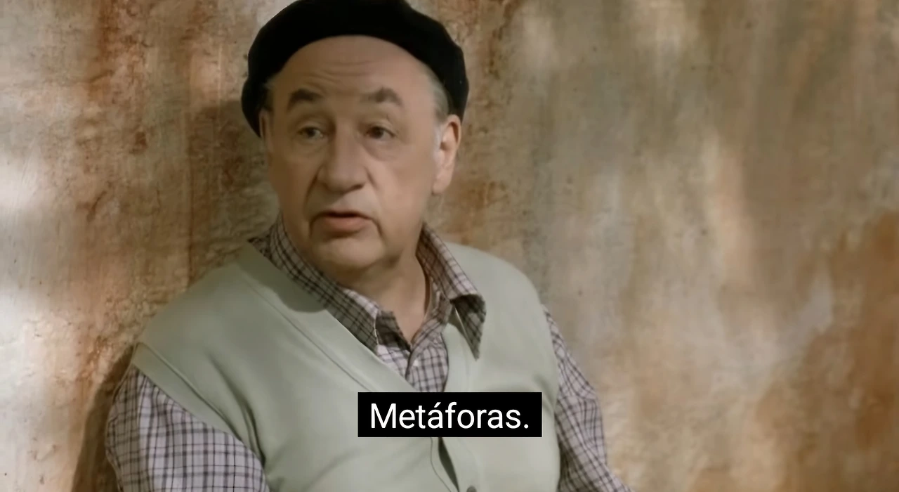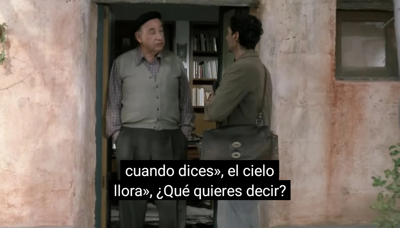 이때 네루다는 마리오가 물어보는 은유에 대해서 예를 들어 설명해 줍니다. "한 가지를 다른 것과 비교하면서 말하는 방법이다"라는 말에 마리오가 예를 들어 달라고 하자 "하늘이 울었다는 것이 무슨 뜻이지?"라고 물어보면서 은유에 대한 대화를 나누는 장면이 나옵니다.