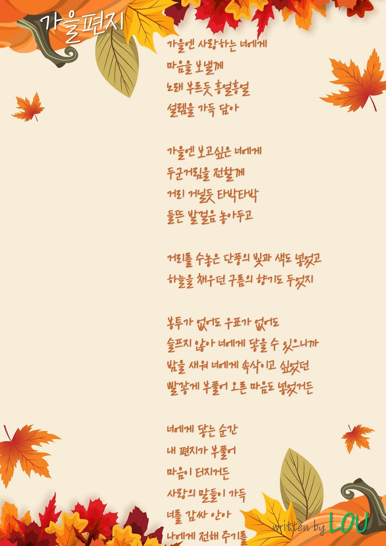 편지가 도착했는지 읽었는지 알 수 없었지만 몇 달을 기다려 답장을 받는 시간은 설렘으로 가득했어요. 유독 가을의 쌀쌀한 바람과 알록달록 낙엽을 보면 마음을 담은 연애편지를 보내야 할 것만 같아요. 오래 전의 설렘을 생각하며 가을에 사랑을 담을 손 편지 한번 써보는 건 어떨까요?