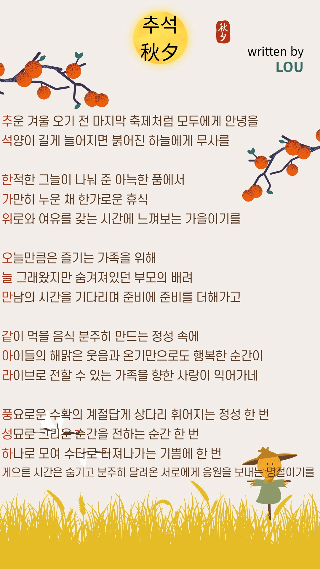 우리나라 대표 명절 중 하나인 추석입니다. 이번 추석은 세찬 비바람에 밝은 보름달을 볼 수 없어 아쉬워요. 이제까지의 추석과는 다르게 연휴도 너무 길어서 시간이 어떻게 흐르는지도 모르게 지나가네요.