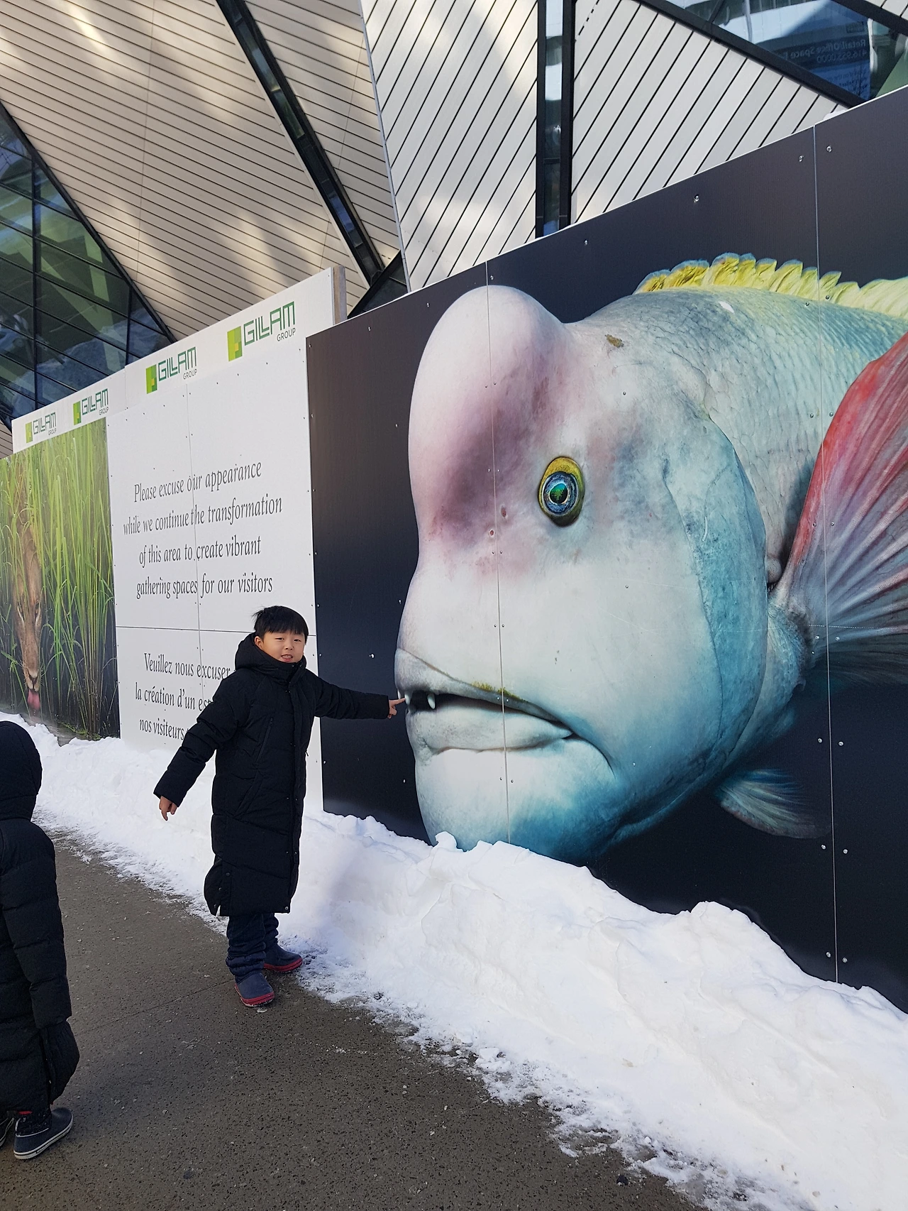 토론토에 도착한 지 하루가 지났다. 여전히 시차 적응이 안 된 우리 셋은 새벽에 깨도 저녁시간이 되면 일단 침대에 누워 눈을 감고 있었다. 힘들어하거나 징징대지 않고 잘 놀고 잘 먹고 잘 자는 아이들 보면 왠지 모르게 힘도 나고 아이들과 많은 도전을 하고 싶은 아드레날린이 용솟음친다. 겨우 하루가 지났지만 나름대로 새로운 환경에 익숙해져 가고 있는 우리. 일찍 눈이 떠져 먹었던 아침밥 때문일까 박물관으로 이동하는 우버 안에서 다시 배가 고픈 아이들 “엄마 또 배고파” “엄마 박물관 가기 전에 먼저 뭐 먹으면 안 돼?” 우리 아기 새들 조잘조잘 떠들어 댄다. 그래 일단 배부터 채워보자. 아이들과 가기로 한 박물관 근처에서 우버를 내렸는데 아이들과 무엇을 먹을지 주변을 돌아보다 찾아낸 맥도날드. 치즈버거와 해피밀로 고픈 배를 채워주고 원래 목적지 로열 온타리오 박물관으로 출발! 박물관 외벽에 다양한 동물들 사진이 걸려 있는 걸보고 참견쟁이가 그냥 지나칠 수가 있나. “엄마 이건 블롭피시라는 건데..” "그래그래 그렇구나" 칭찬해 주며 분주히 박물관으로 걸음을 옮겼다.