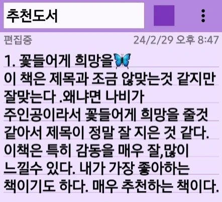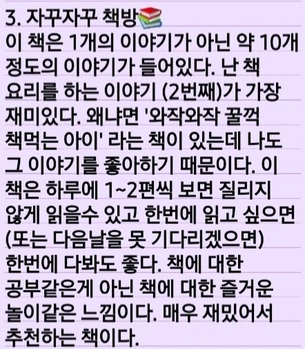 도서관이나 서점에 가면 만화책을 많이 읽지만 좋아하는 책이 생기면 옆에 두고 여러 번 읽어보는 버릇이 있어요. 너무 재미있거나 좋은 책이 생기면 많은 친구들과 같이 읽으면 얼마나 좋을까 생각했어요. 추천하는 책들을 친구들도 읽어보면 좋을 것 같아요.