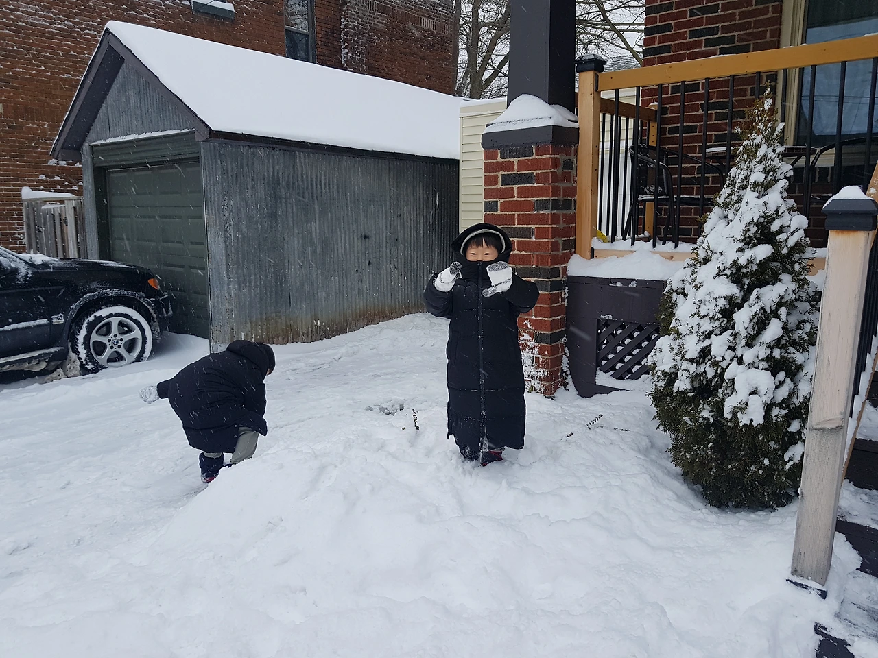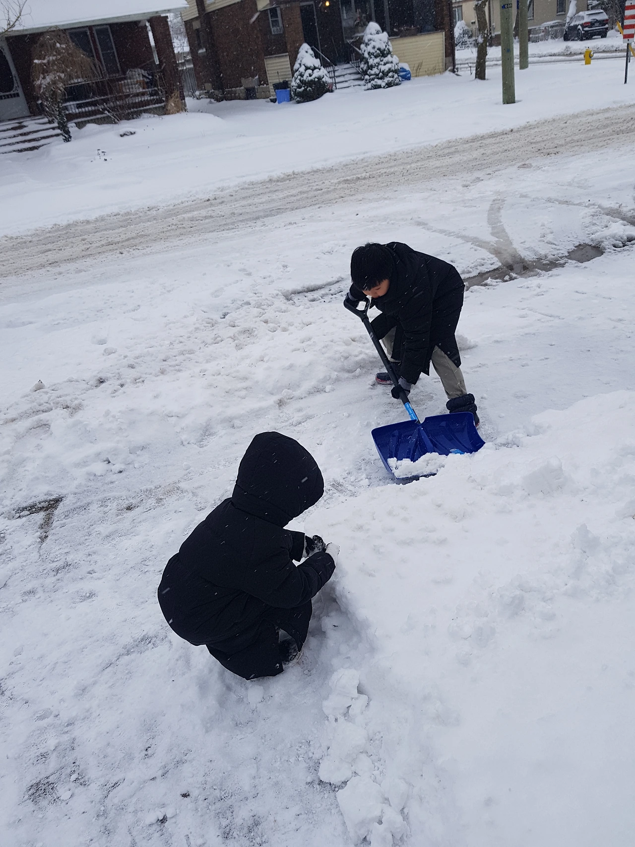 눈이 많이 와서 즐거운 아이들은 수시로 옷을 입고 밖으로 뛰쳐나갔다. 문만 열면 집 앞마당에 눈이 쌓여 있으니 추운 줄도 모르고 놀았다. 엄마를 불러대도 창문으로 슬쩍 내다보는 것만으로도 깔깔대며 장난을 친다. 눈사람도 눈싸움도 눈을 치우는 것까지 아이들은 즐거운 놀이였다. 집 문을 열고 나가 엘리베이터를 타고 내려가 여러 사람들이 다니는 곳이 아닌 문만 열면 엄마가 보이는 집 앞에서 즐겁게 눈 놀이를 할 수 있으니 엄마도 아이도 편하고 안전한 느낌이었다.