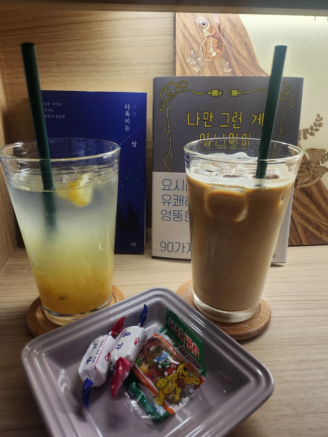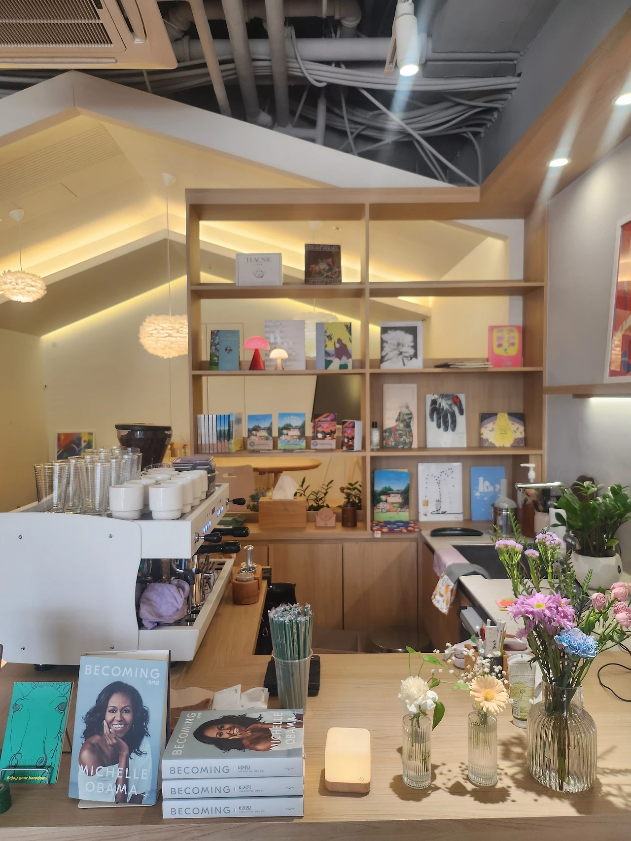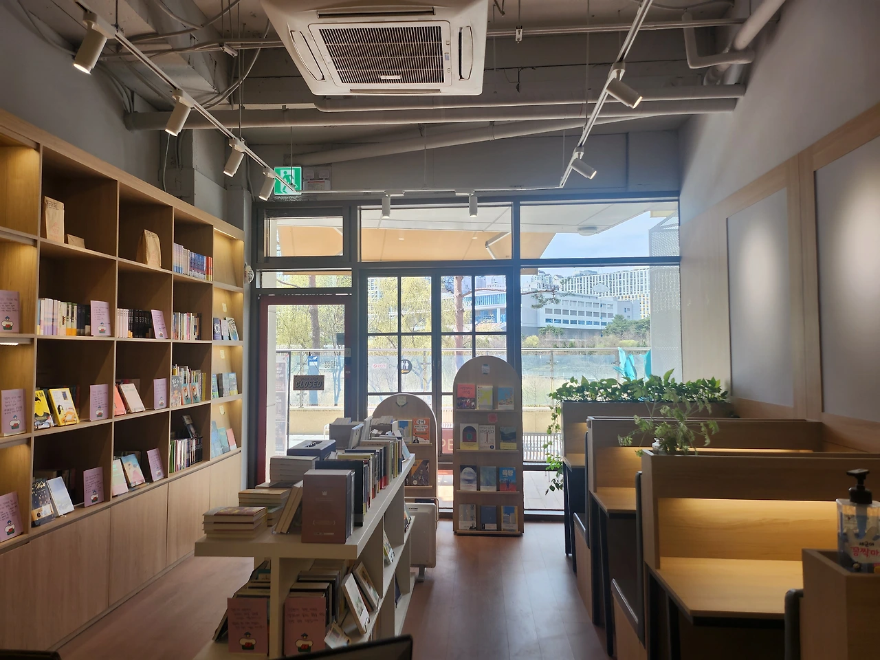 오픈부터 눈여겨봤던 서점이 이동하는 중간에 내 눈에 들어왔다. “저기야 저기 내가 가고 싶다고 한 서점!” 책도 서점도 좋아하는 공통점을 가진 우리는 종종 독립서점을 찾아가 책도 보고 차도 마시며 구입도 했었더랬다. 방앗간을 지나치지 못하는 참새처럼 우린 서점을 향해 직진했다. 인스타로만 만났던 서점이라 호수가 보이는 광교 중앙에 자리한 서점이 못내 궁금했는데 예상과는 다르게 한적한 곳이 아니라 놀랐고 서점 안은 시끌시끌한 밖과 달리 고요하고 상큼해서 다시 한번 놀랐다.