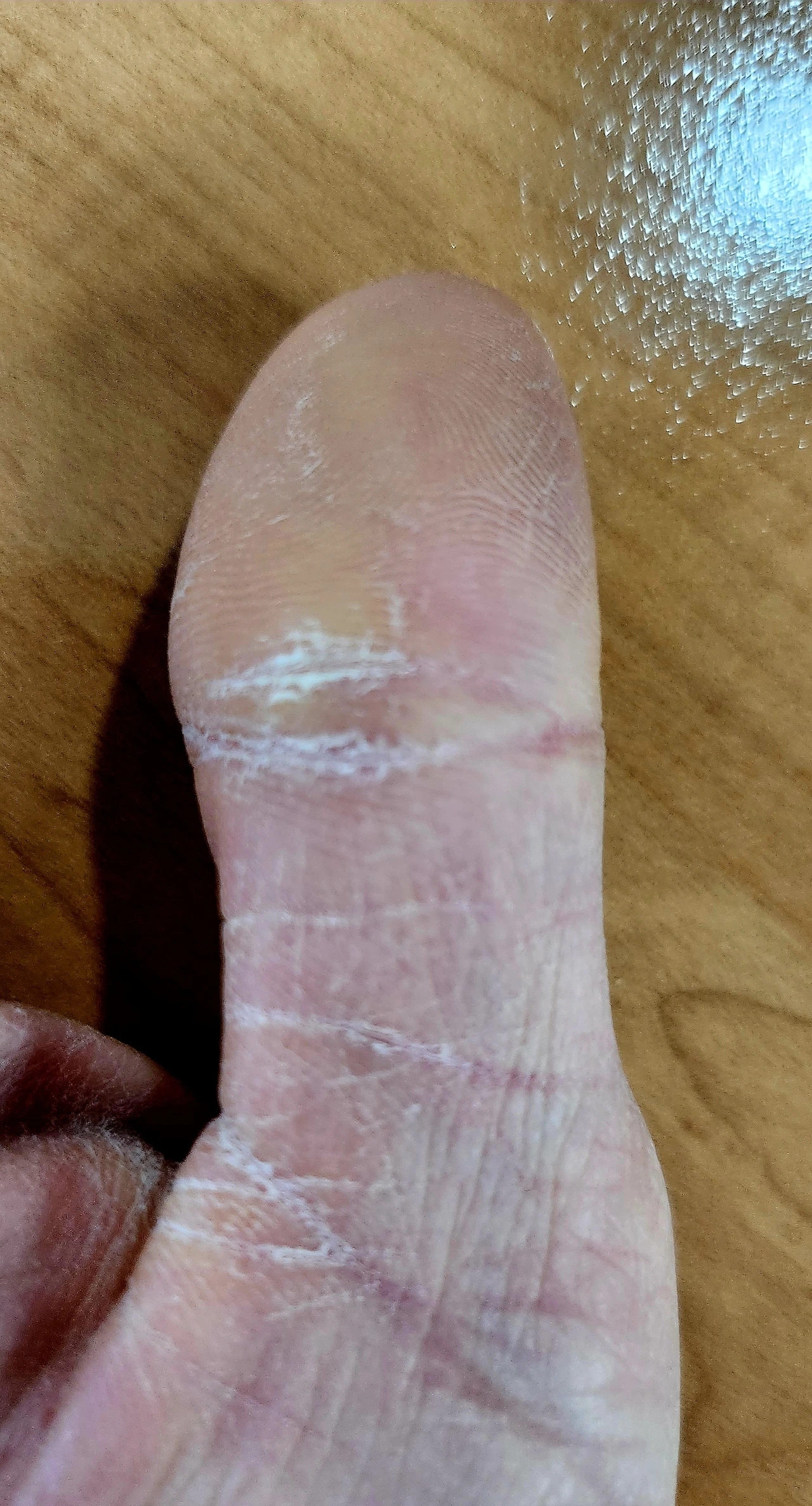손의 피부의 얇게 덮인 세포단위로 껍질이 하나씩 벗겨지는 듯하게 느껴진다. 갈라지고 벗겨진 살들은 고통스럽고 아프기 그지없다.