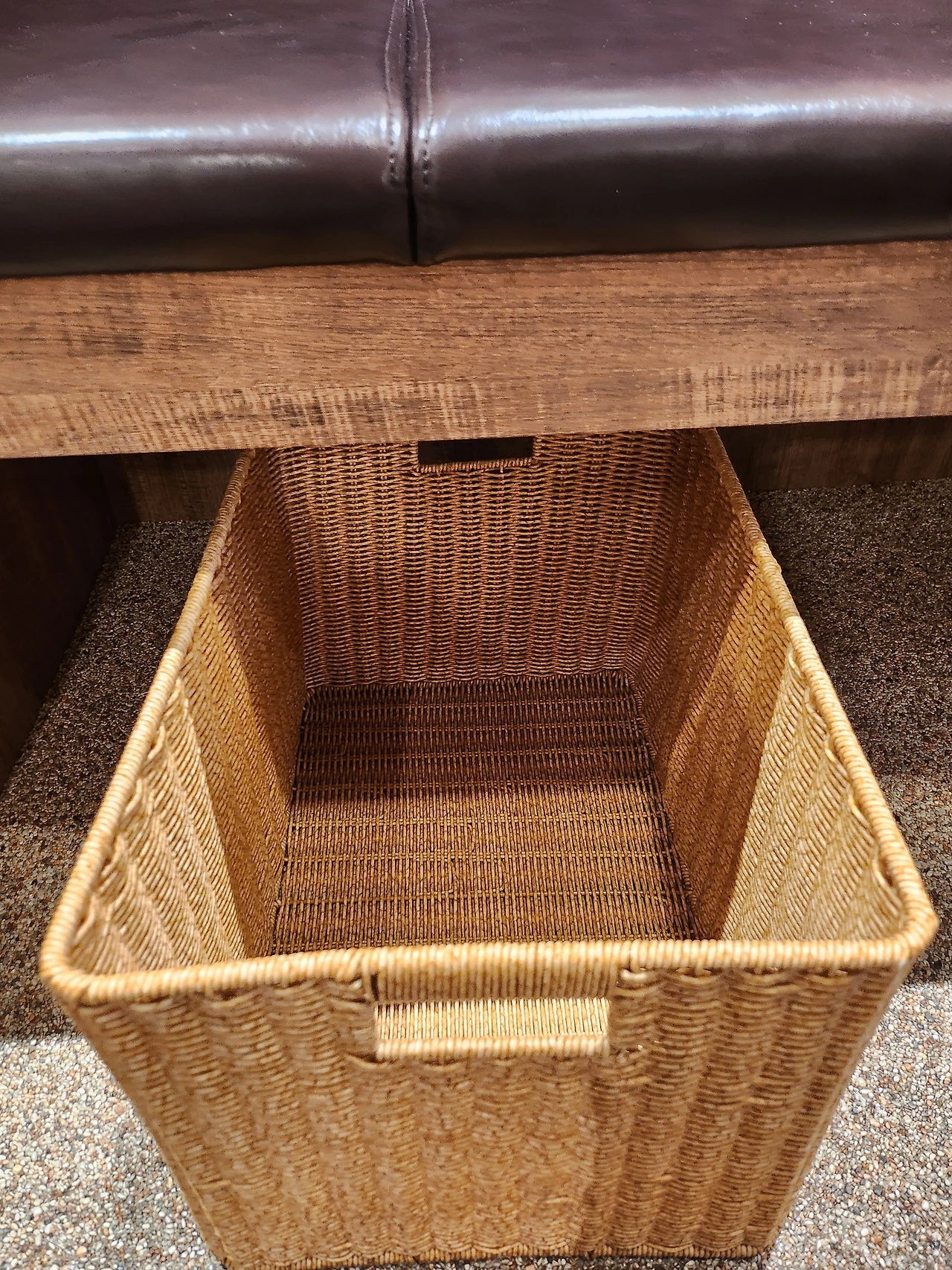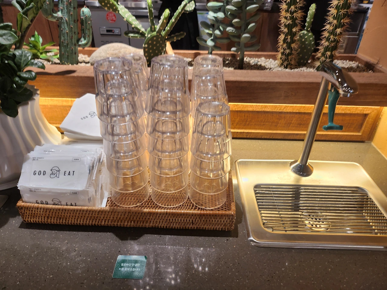 자리에 앉으면서 감동스러운 포인트가 있었으니 바로 나무로 된 바구니였다. 사람마다 다르겠지만 좌석 아래 빈 공간에 저런 나무 바구니가 마련되어 있다. 살며시 빼내어 가져온 가방을 친구와 잘 담아서 쓱 밀어둔다. 사람들이 앉는 좌석에 가방이 자리를 많이 차지하는데 저런 작은 배려가 매장을 좀 더 깔끔하게 보이고 사람들에게도 편리함을 주는 게 아닐까 생각이 들었다. 셀프바에서는 물도 냅킨과 물티슈도 원하는 만큼 사용할 수 있어 편리했다.
