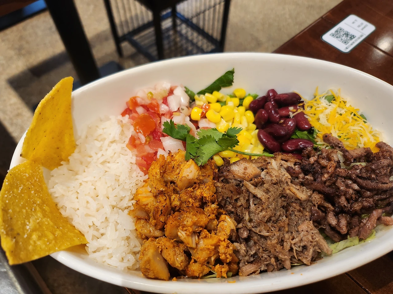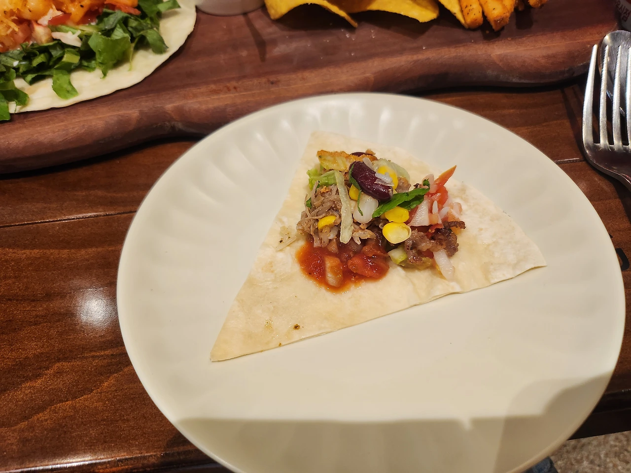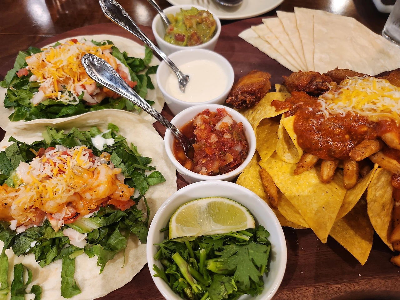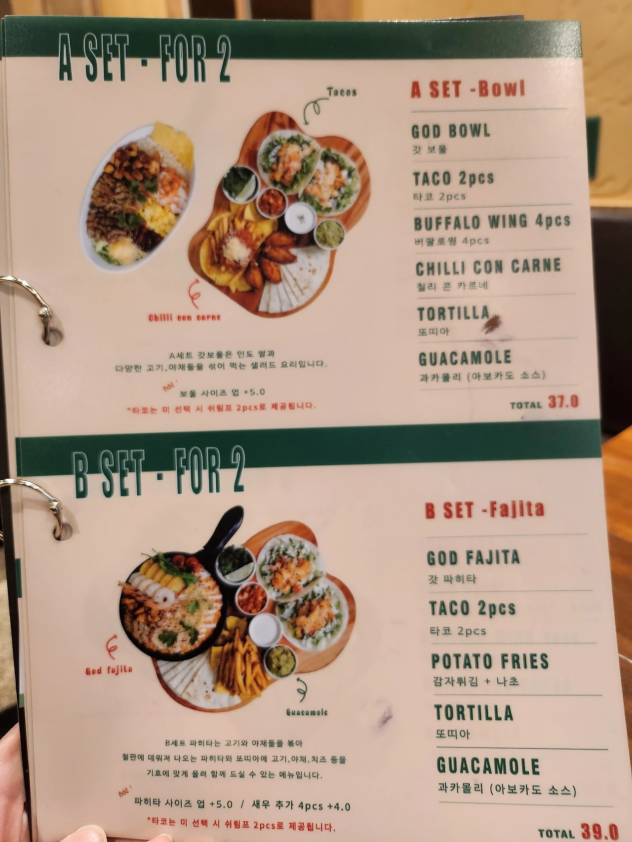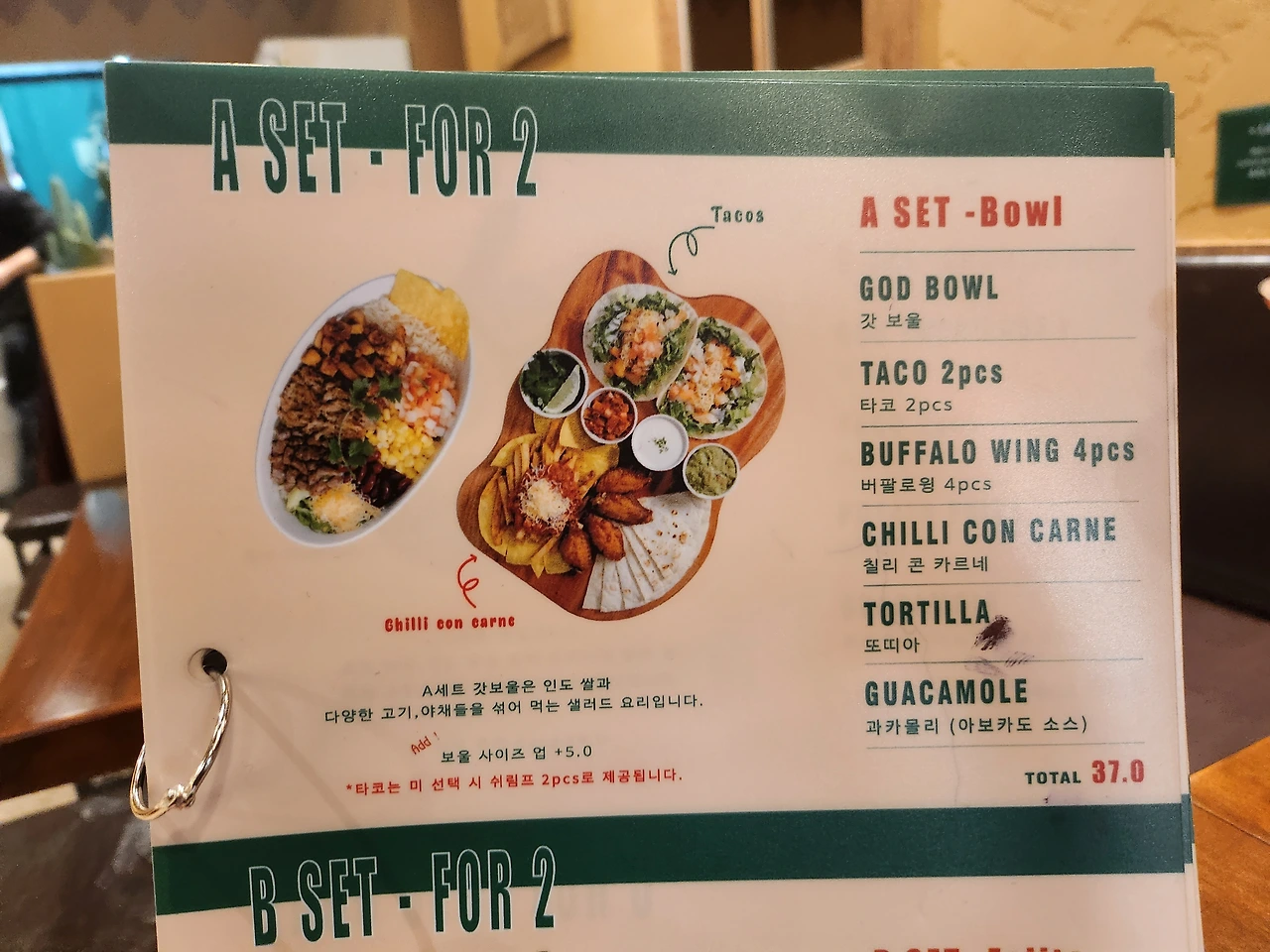 세심함에 감동하고 있는데 음료가 먼저 나왔다 컵까지 너무 깜찍해서 꺅~ 소녀들처럼 소리를 지르며 컵에 적당히 음료를 따라본다. 컵과 테이블, 냅킨과 물티슈에 동일한 캐릭터가 그려져 있어 더 재미있게 느껴졌다. 메뉴가 하나씩 나오고 테이블이 비좁을 만큼 꽉 찼다. 2인분인데 식욕 좋은 젊은 남성분들 기준인가 보다. 양이 너무 많아서 놀라고 다양한 메뉴를 한눈에 볼 수 있어 즐거웠다. 눈으로 먼저 즐기고 입으로 다시 즐기는 맛있는 타코와 보울! 나쵸와 감자튀김의 환상 궁합에 손이 간다 손이 가~