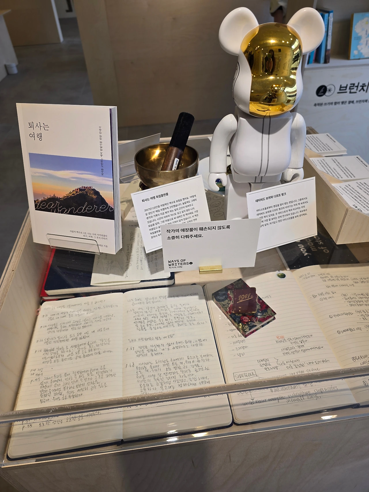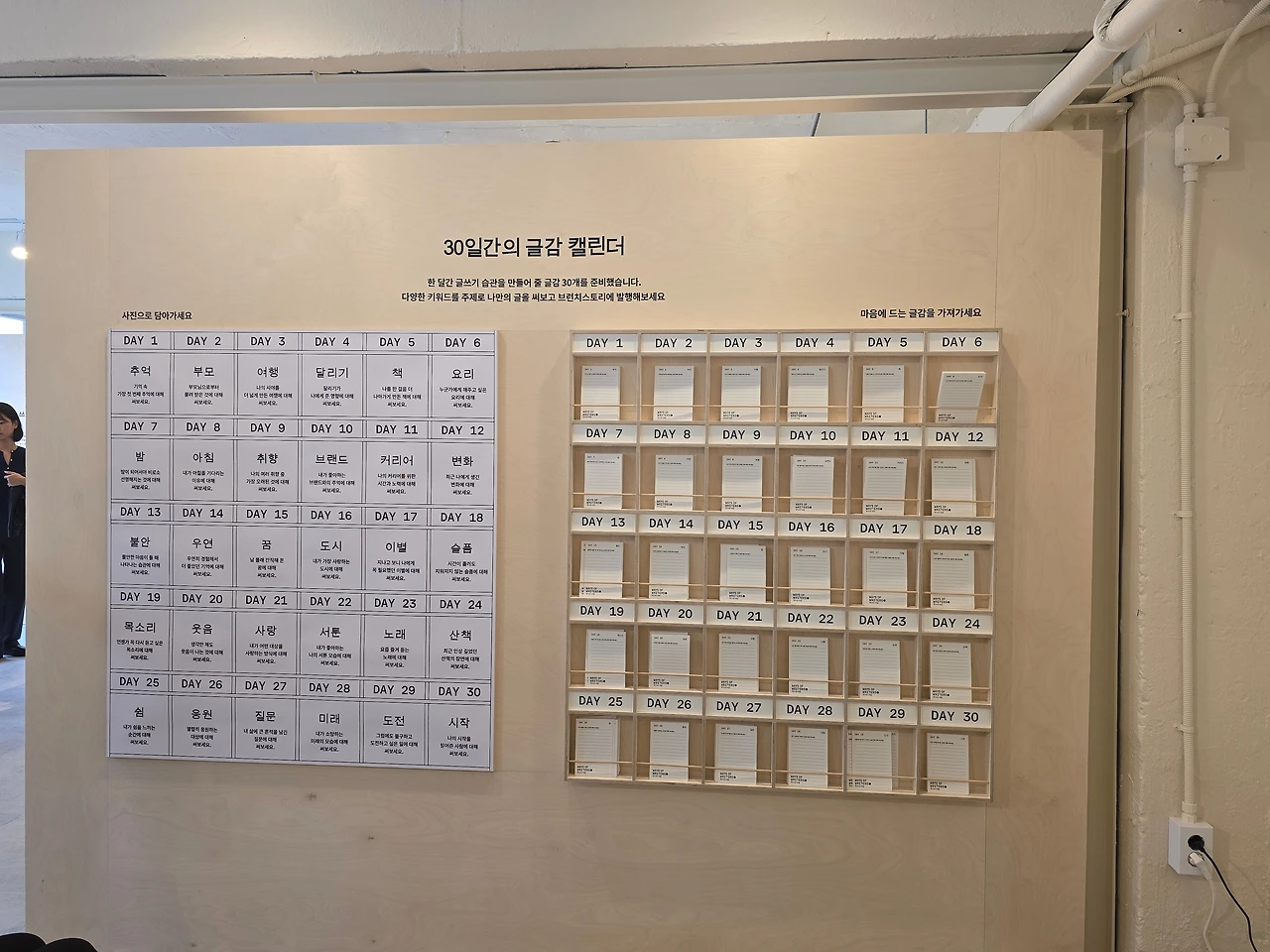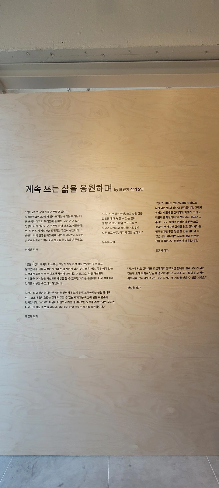 얼마 전 성수에서 열린 ‘브런치 작가를 위한 팝업 전시회 ’작가의 여정‘에 다녀왔다. 소중하고 감사한 인연, 브런치 작가를 같이 준비하고 지금도 같이 브런치 글을 쓰고 크리에이터가 되면 축하하고 조회수 폭발에 같이 환호하는 소중한 동기들과 함께. 글을 쓰고 싶고 작가가 되고 싶은 각각의 이유가 나름대로 존재하지만 끊임없이 읽고 쓰는 열정이 모두가 가득 차고 넘친다. 함께 만나 즐기기 위해 입장을 하면 ‘브런치 작가’인지 물어본다. 앱을 열어 브런치 작가임을 보여주자 너무나 반가운 소리로 반겨주었다. “작가님!” 왜 그렇게 떨리고 울컥하는지. 감사하고 떨리는 마음으로 팝업을 구경했다.