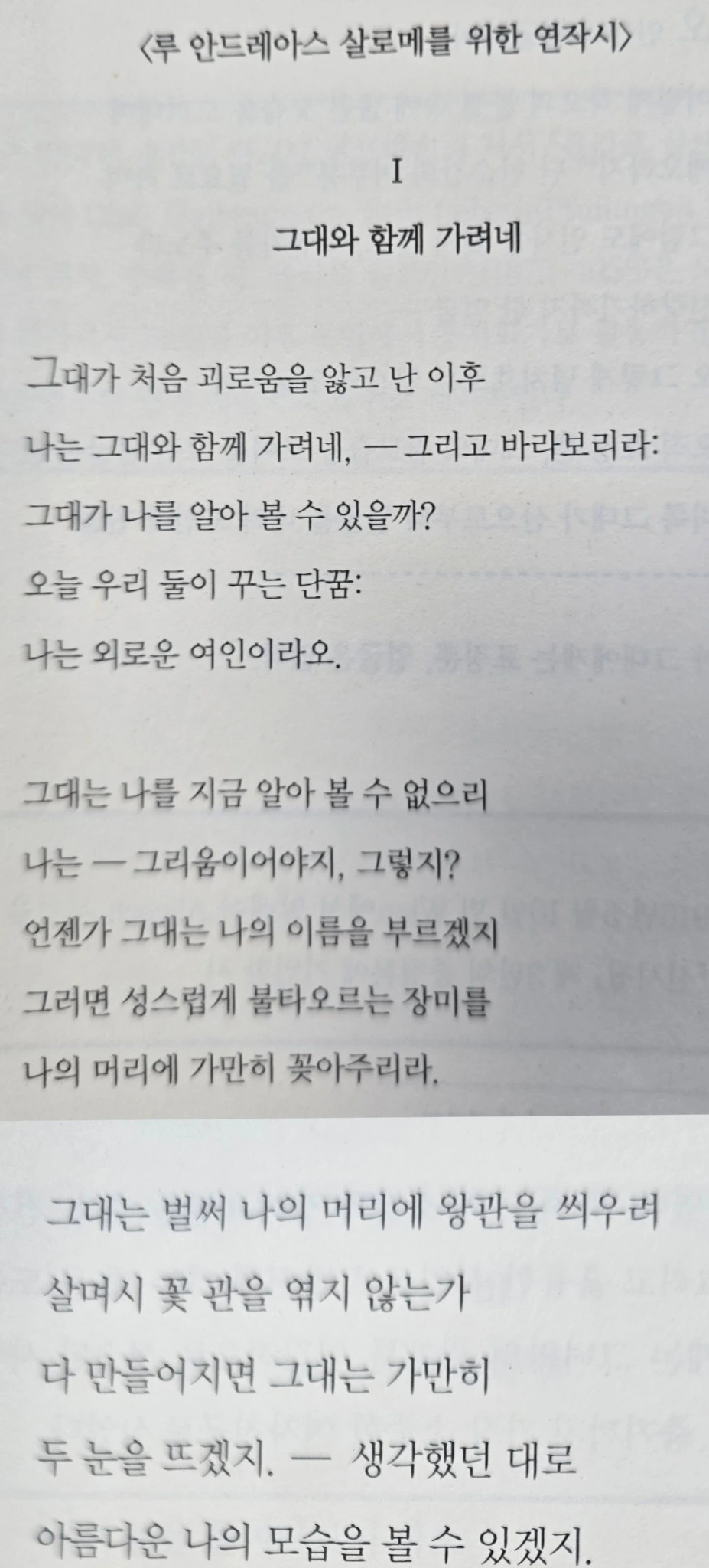 릴케가 루 살로메에 대한 사랑이 지극 했기에 루에게 바치는 연작시를 비롯해 여러 시를 써내려 갔는데요. 여러 시들이 루 한 사람을 향해 절절한 사랑을 표현하고 있어요. 시 하나하나가 사랑이 가득 담겨서 읽는 내내 달콤하게 느껴지며 흐뭇한 미소가 입가에 번지는 건 저뿐일까요? 시들이 많이 다 적거나 이곳에 옮길 수는 없어 부득이하게 몇 개의 시만 책에서 발췌하여 감상해 보려 합니다.