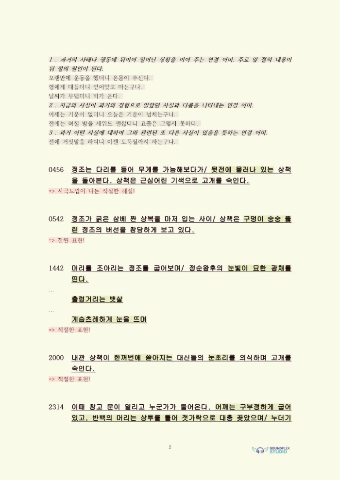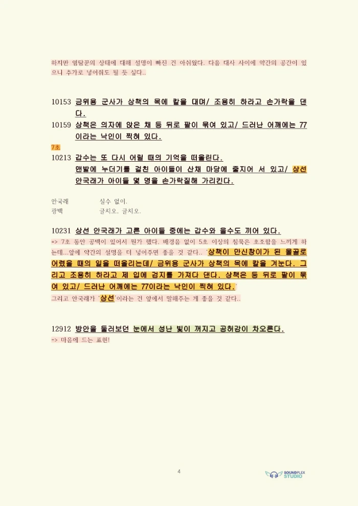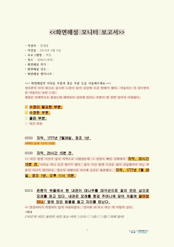 화면해설대본에다 형광펜 표시를 하고 의견을 적는데 시간 관계상 좋은 부분은 생략하고 수정이 필요한 부분에 대해서만 언급합니다..