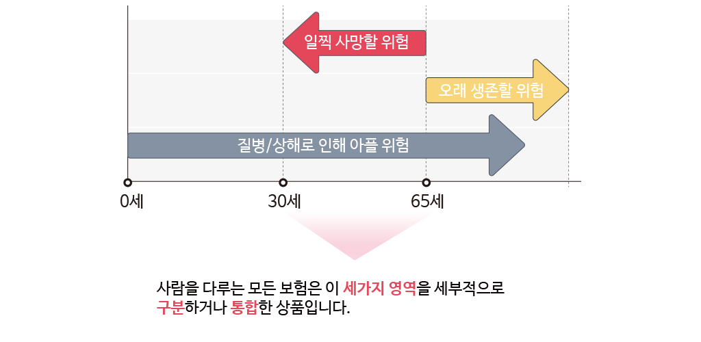 레몬클립에 따르면, 세상에 존재하는 모든 보험은 위의 구조로 설명할 수 있습니다. 사람이 살아가면서 보험이 필요한 상황은 딱 두 가지입니다. 1. 우리가 죽거나, 2. 죽지 않는다면 아프거나 다쳤을 때죠. 이를 보험사는 ‘위험’이라는 용어로 커뮤니케이션합니다. 3. 오래 생존할 위험은 노후관리에 대한 내용인데, 앞의 두 가지와는 성격이 조금 다릅니다.