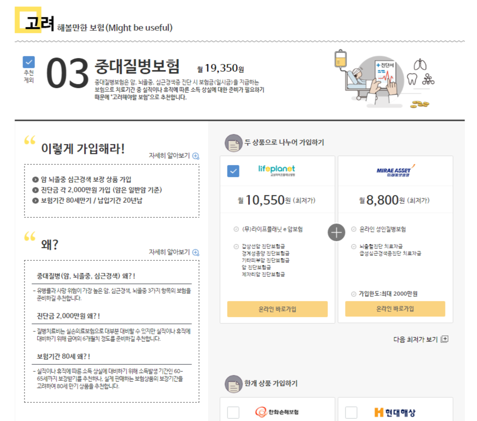 일상적인 병원비는 앞서 말한 실손보험으로 대비하고, 큰 병에 걸렸을 때는 중대질병보험으로 대비할 수 있어요. 여러 특약을 붙여서 'Full-Package'인듯 하지만 나도 모르게 세는 돈이 많아지게 하는 게 아니라, 정말 대비해야 할 위험에만 정확하게 대비할 수 있도록이요. 희귀병과 같이 확률이 많이 낮은 영역에 대해서는 차라리 평소 자산관리를 통해 마련해 둔 비상자금으로 대비하는 것이 우리에겐 현명한 방법일 거예요.