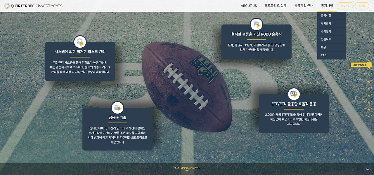 쿼터백은 투자자들이 모르는 데이터를 쓰는 게 아닙니다. 다만 신뢰할 수 있는 데이터를 구매하고, 사람이 본다면 트렌드에 따라 놓치는 데이터가 발생할 때, 저희는 모든 범위의 데이터를 지속적으로 모니터링 합니다. 이를 분석하는 툴을 개발하고, 다시 상위 툴을 개발하고, 다시 상위 툴을 개발해서 상품 라인업까지 나오는 거죠. 쿼터백은 머신러닝을 활용해 이 분석 툴들을 자체적 개발하고 있습니다. 이 시스템들을 아울러 로보 인베스트먼트라고 부르고요.