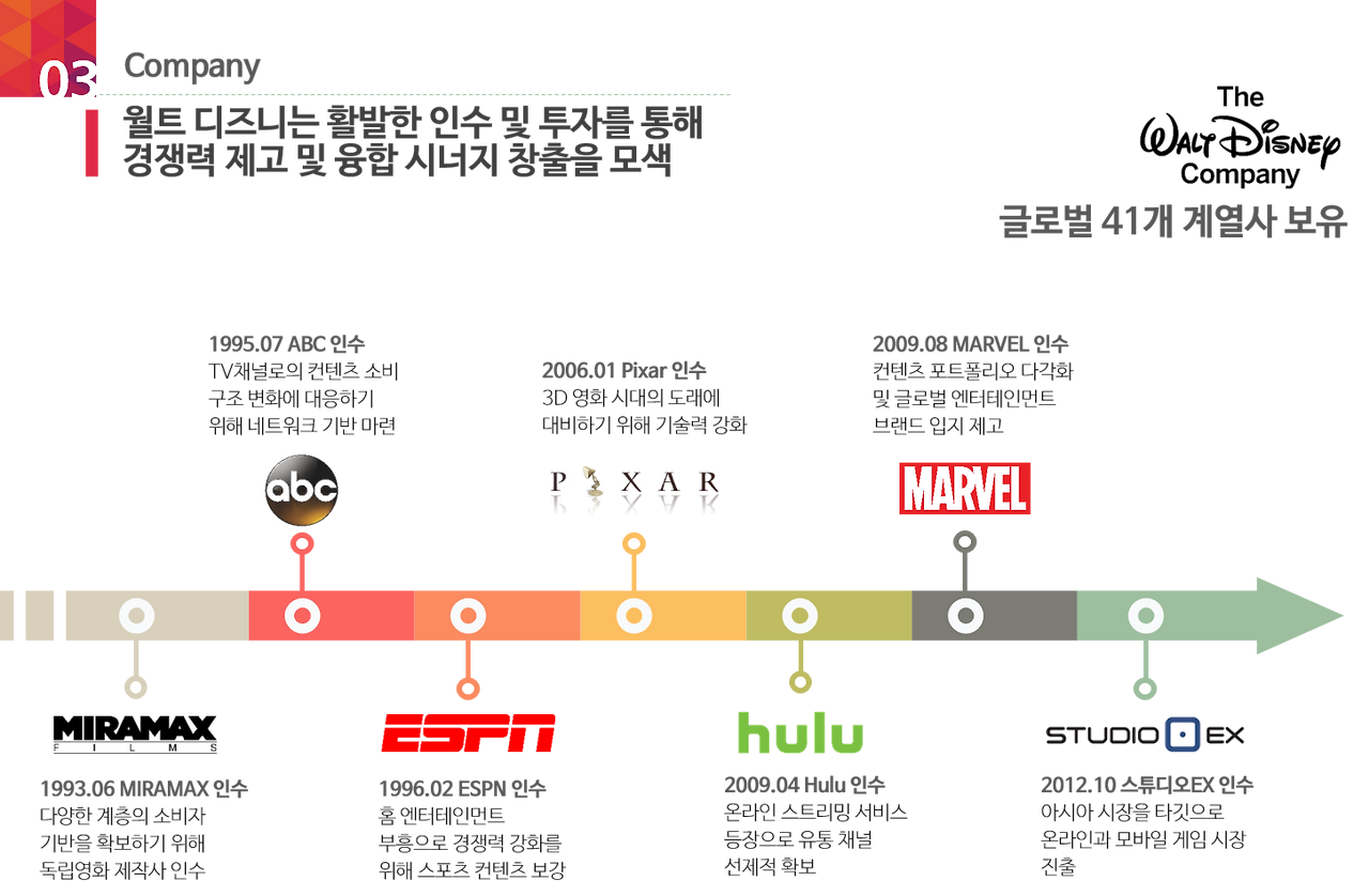 또 다른 사례를 볼까요. 미키마우스로 시작해 지금은 세계적인 엔터테인먼트 기업이 된 월트 디즈니도 시대의 흐름에 맞춰 활발한 인수 및 투자 활동을 전개했습니다. 최근 등장한 기업 뿐 아니라 오랜 역사를 가진 기업에서도 이런 움직임을 발견할 수 있는 셈이죠.