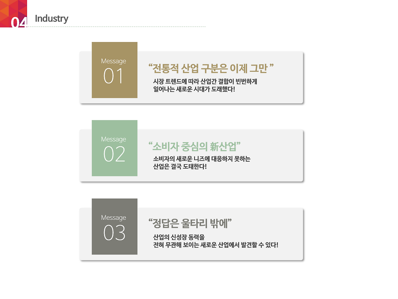 여기에 이어 더 이상 한 산업의 흥망을 결정짓는 것이 해당 산업의 다이나믹에 있지 않다는 점을 언급하고 싶습니다. 아무리 우리가 오늘 여기서 열심히 하고 있더라도 다른 산업에서 일어나고 있는 무엇 때문에 오늘 내가 하는 일들이 전부 없어질 수도 있는 상황입니다. 바꿔 말해 산업은 고객에 맞춰 변화할 것이기 때문에 어떤 산업의 신성장 동력은 전혀 무관해 보이는 타 산업에서 발견할 수도 있을 겁니다. 이에 잘 대응해 나가기 위해서는 울타리 밖을 바라보고 전체를 조망할 수 있어야 합니다.