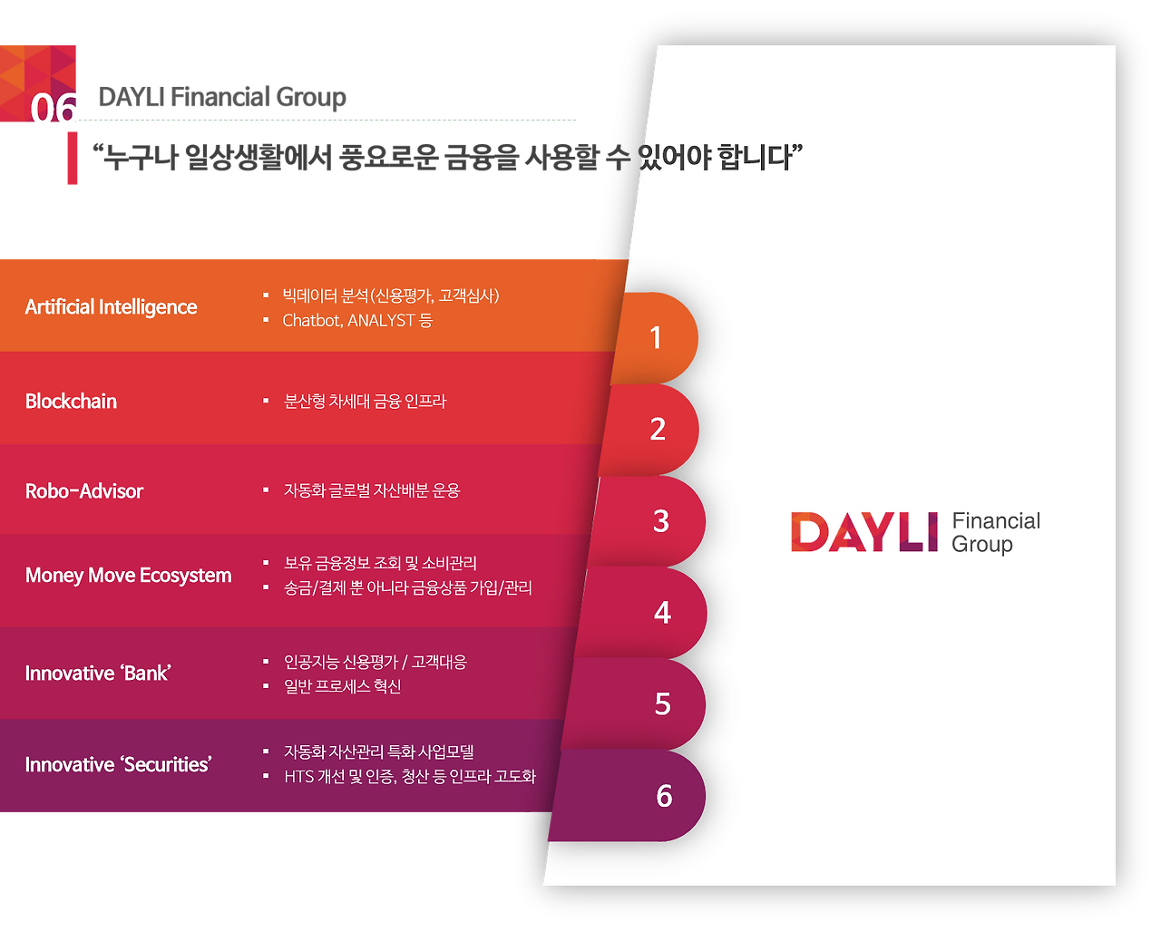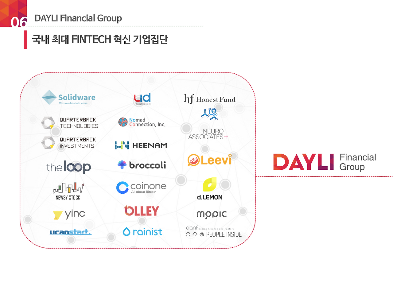 데일리금융그룹은 2015년 2월에 설립된 국내 최대 규모의 핀테크 기업입니다. 인공지능, 블록체인, 로보어드바이저 등 금융혁신에 필요한 서비스 및 기술 역량을 바탕으로 고객의 일상이 풍요로워지는 금융을 전 세계에 제공하는 것을 목표로 하고 있습니다.